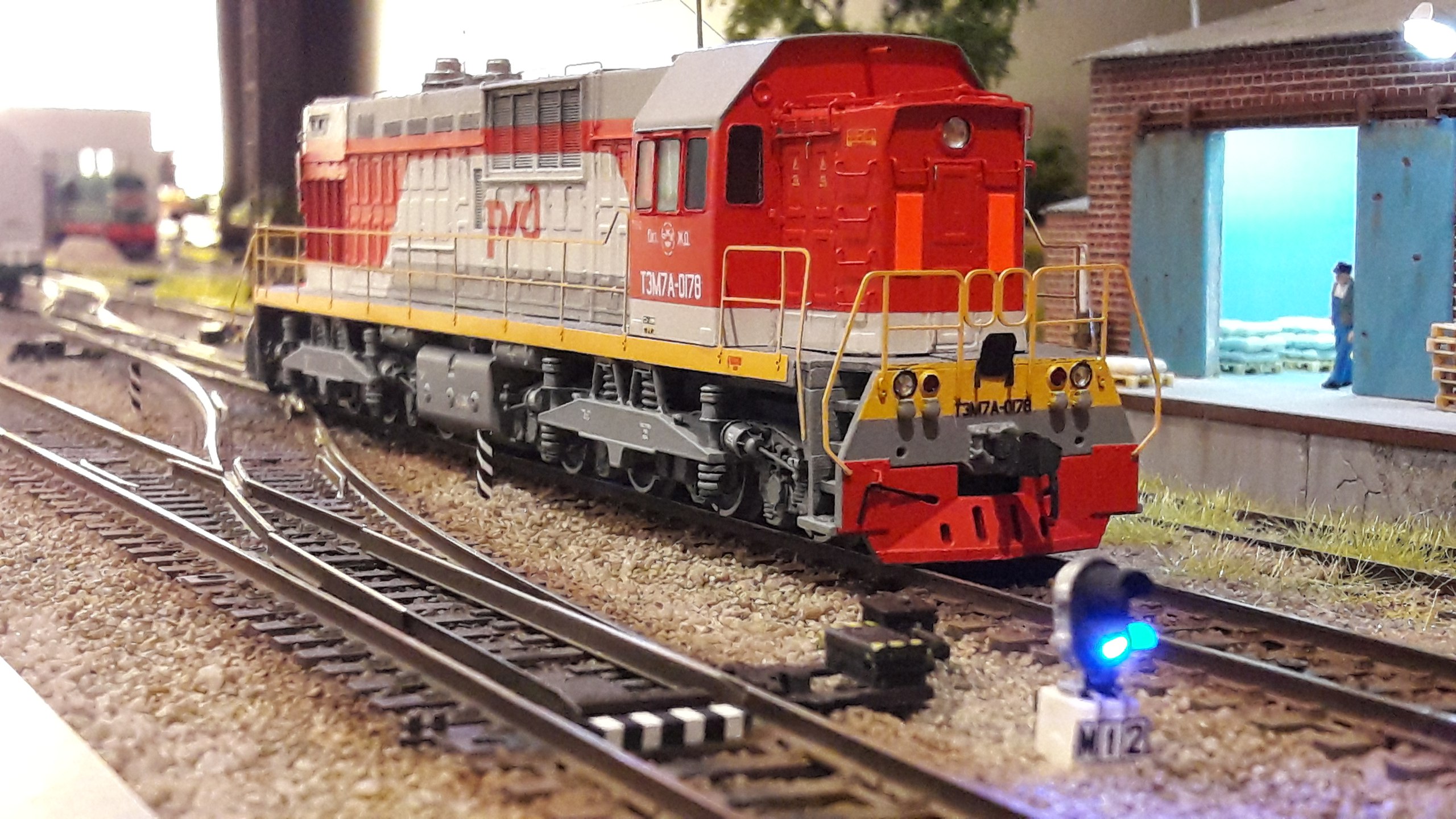 Фото модели тепловоза ТЭМ7А-0178 Окт.Ж.Д. в корпоративных цветах РЖД на домашнем макете Александра Козлова (Axwell).