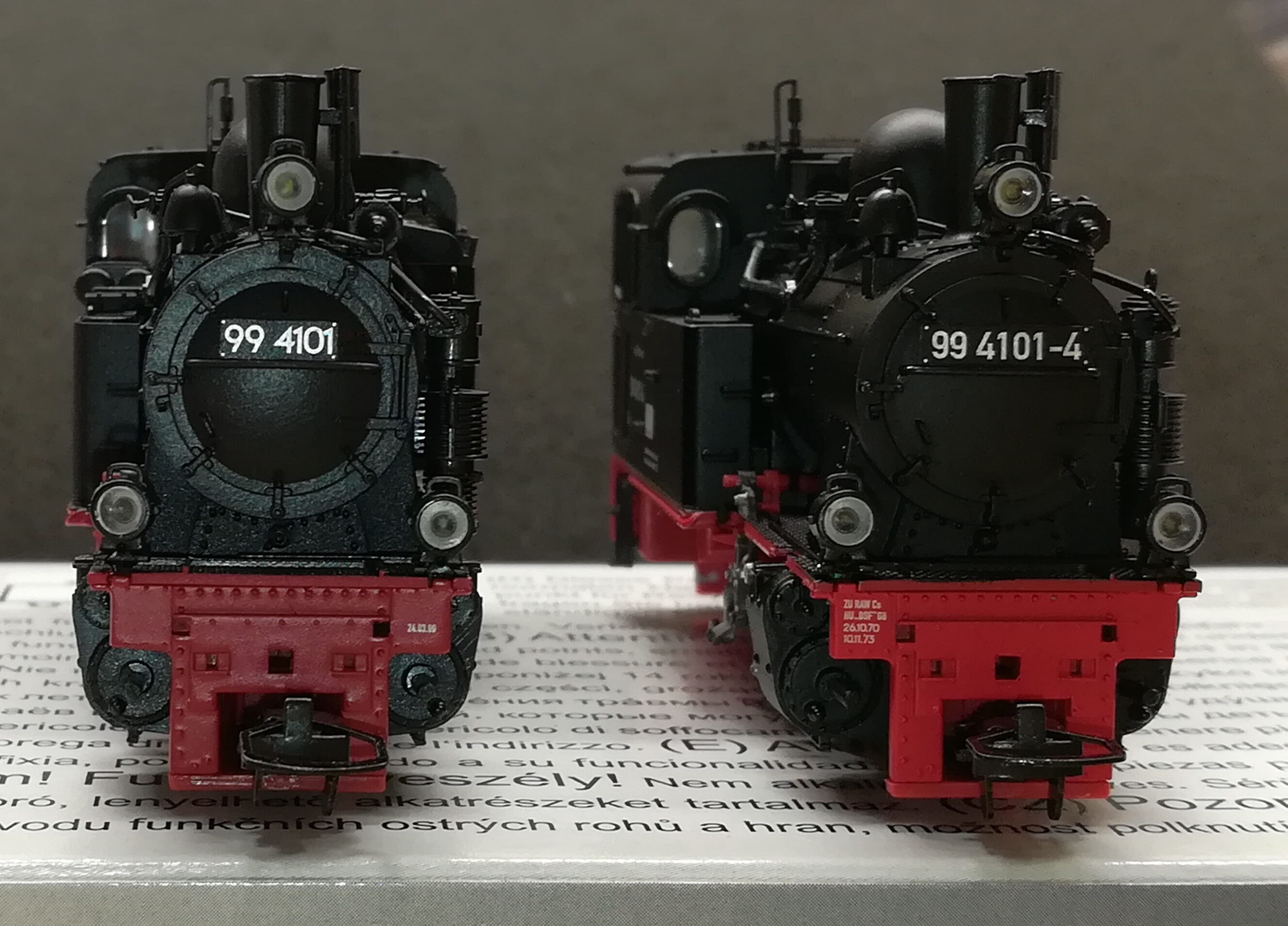 В обзоре участвовал мой собственный Tillig 02971 четвертой эпохи. Приехал под заказ плюс для установки декодеора Tillig 02972 пятой эпохи приписки частной действующей дороги HSB. Конкретно по этой узкоколейной дороге, точнее компании имеющей несколько действующих узкоколейных дорог на территории Германии я подробнее напишу в другой теме. А сейчас несколько фото на которых видны различия моделей в зависимости от эпох. Напомню, HSB имеет на своих локах исторические таблички привязанные к третьей эпохе до введения контрольной цифры.