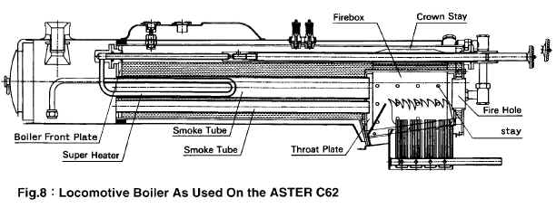 Котел модели JNR C62 имел емкость 400 мл с 6-ю жаровыми трубками. Размер угольных колосников 64 Х 47 мм. Модель получилась увесистой – 7,2 кг. Удачная конструкция С62 заложила основу для будущих угольных моделей UP Big Boy #4002, SNCF 232 U1, AD 60 Bayer Garratt, C&O H-8 Allegheny, BR 52 DB/BR.