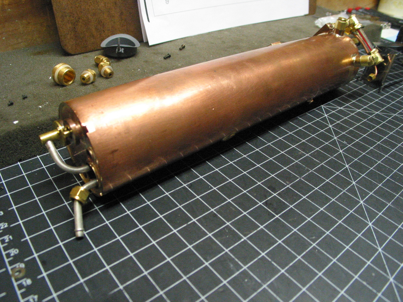 Барабан котла с дымовыми трубами имеет вырез в задней нижней части для установки "сухой", т.е. не омываемой водой, топки Сама топка выполнена из нержавейки и облицована теплоизолирующим слоем из керамической ваты Отдельный лобовой лист служит для декоративных целей и закрепления арматуры: регулятора, крана сифона, клапана свистка, водомерного стекла, манометра, крана отбора пара на смазочное устройство (лубрикатор). Медная жаровая труба (обычно диаметром 16 мм) позволяет разместить в ней петлю перегревателя В дымовой коробке тоже всё, как у людей - сифон, коллектор перегревателя, трубки подачи смазки