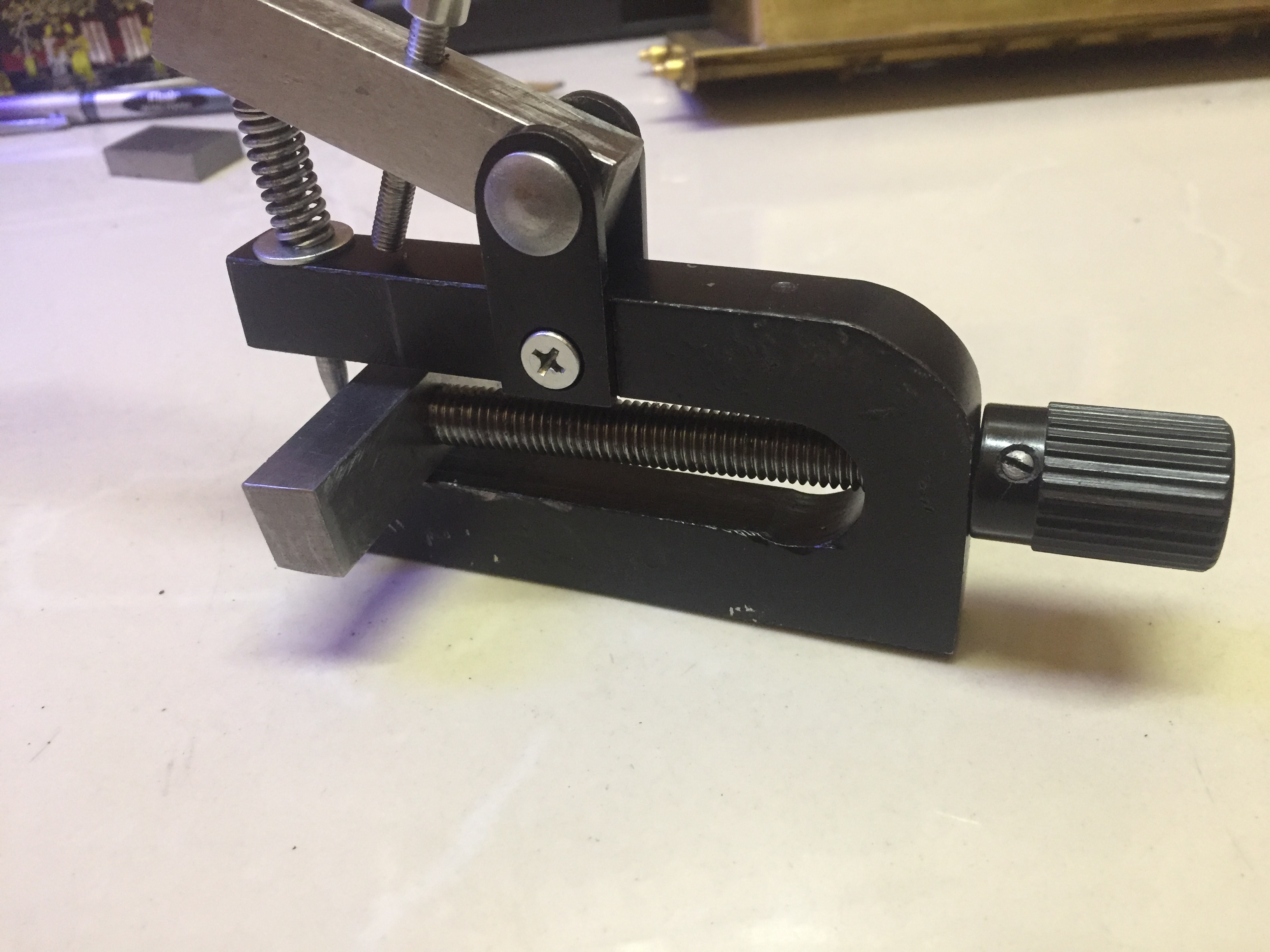 Пришлось в рычаге просверлить отверстие, нарезать резьбу и вкрутить винт М5 для ограничения хода. Чтоб получить максимальную четкость заклепки и не пробить лист, винт поворачивал буквально на несколько градусов.