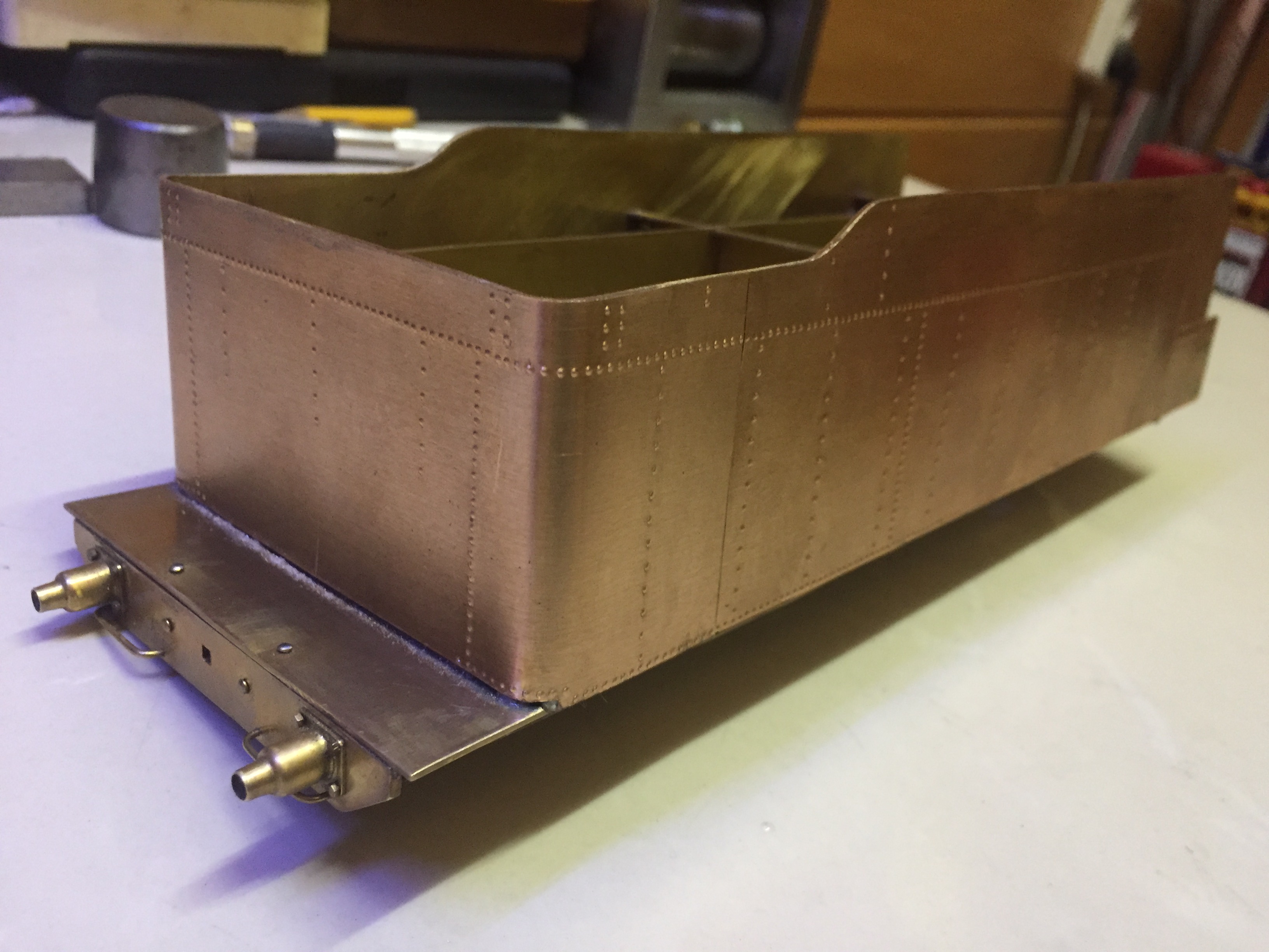 Сделал переднюю стенку бака с угольным лотком и площадкой. Долго подгонял и исправлял косяки. Дело в том, что площадка и стенка это одна гнутая деталь. Крепежные отверстия просверлил на плоской заготовке... И зря! После гибки отверстия убежали на 1,2 мм . Хотел сделать их повыше, над уровнем воды, чтоб не пришлось играться с герметиком. А они оказались выше нужного - вышли на торец перегородки. Пришлось их запаять