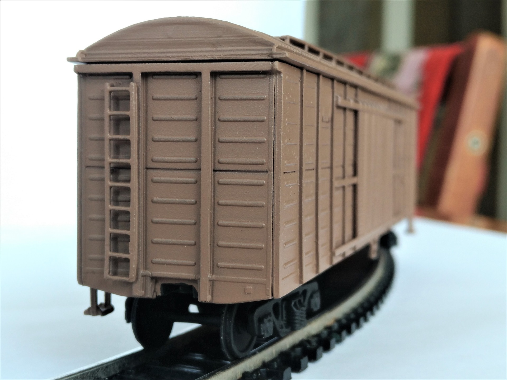 Осваиваю печать на фотополимерном 3D принтере. Для пробы пера была взята модель грузового вагона 11-270. Автор 3D модели Polkin https://cults3d.com/en/3d-model/various ... ar-1-87-h0. Детализацией не заморачивался. Это первый мой опыт, и мне важно было понять получится ли вообще что-нибудь. Корпус вагона печатался отдельными стенками и потом склеивался. Так как габариты вагона не помещаются в область печати принтера, пришлось длинные стенки, днище и крыщу печатать из двух частей и склеивать. В этом я еще не очень опытен, поэтому можно наблюдать места склейки. Крыша вагона не приклеена из соображений дальнейших экспериментов. Так что щель между стенками и крышей это не косяк.