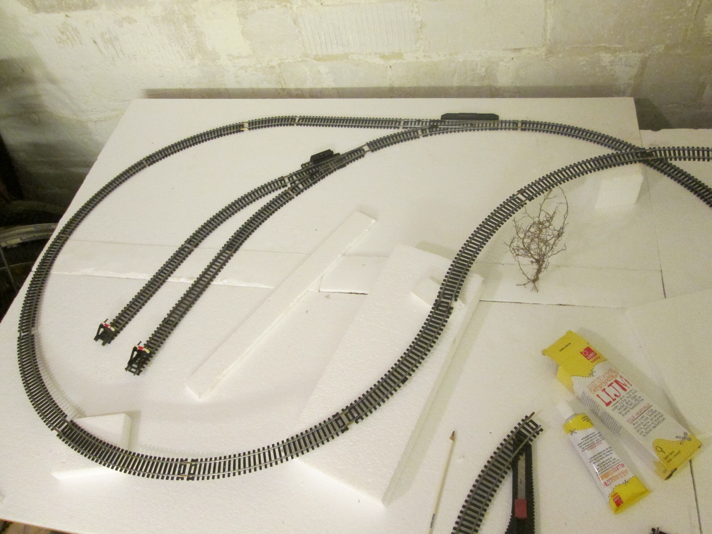 по возможности сколько хватало лимовских рельсов заменил все ржавые. пришлось по колдовать над путями, чтобы было как надо. осталось в запасе совсем ничего, но вот прямых не хватает и мелких чтобы сделать отворот небольшой для путей в депо, также отказался от идеи кругового депо и буду делать депо обычное плюс рядом вагонное депо или все 4 ветки сделать в одно большое депо. пошарился по рельсам от мэрклин были там не ржавые, вот их и запрячу в депо.