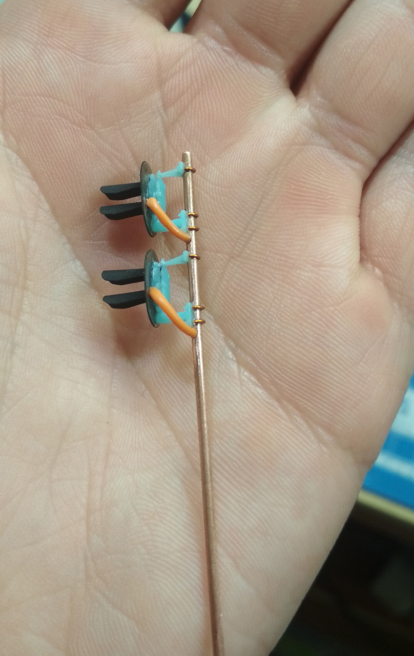 Классно получилось. Поражен точностью склейки столь маленьких деталей. А какие светодиоды были использованы? 0603 ? Или еще меньше? Да, и наверно не стоит затягивать провод в изоляцию на участке между головкой и мачтой. Просто скрутить его и пропитать чем-то (клеем, эпоксидкой). Чтоб потоньше был. Можно попробовать пропитать клеем "Дракон", который для поклейки пенопласта. Он вроде после застывания немного эластичный. И нормально разбавляется обычным спиртом 96%.