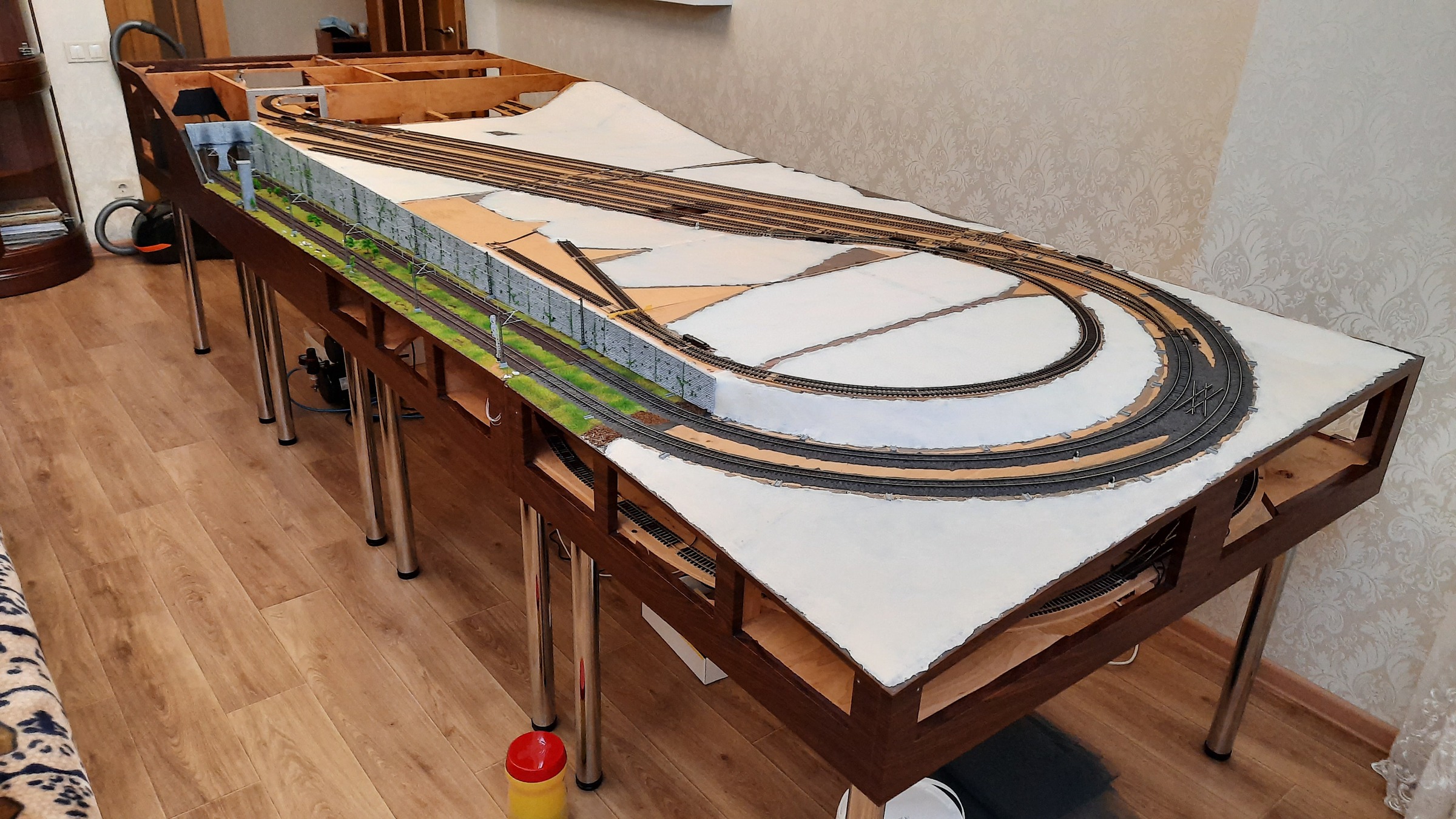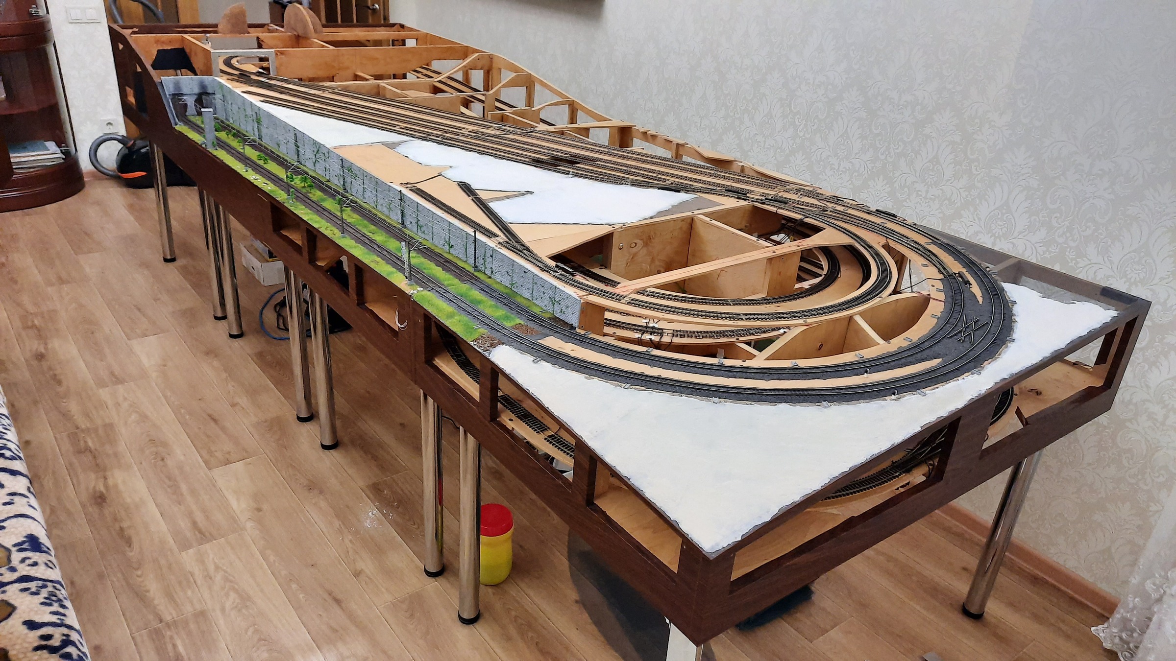 Там будет типа ремонт съездов)) Просто лично мне эти съезды не особо нужны, вот и решил обойтись без 4 стрелок на макете. Основная задумка макета - прибываюшие и уезжающие поезда, скрытые от глаз, и создающие эффект более широкого, чем макет, пространства.
