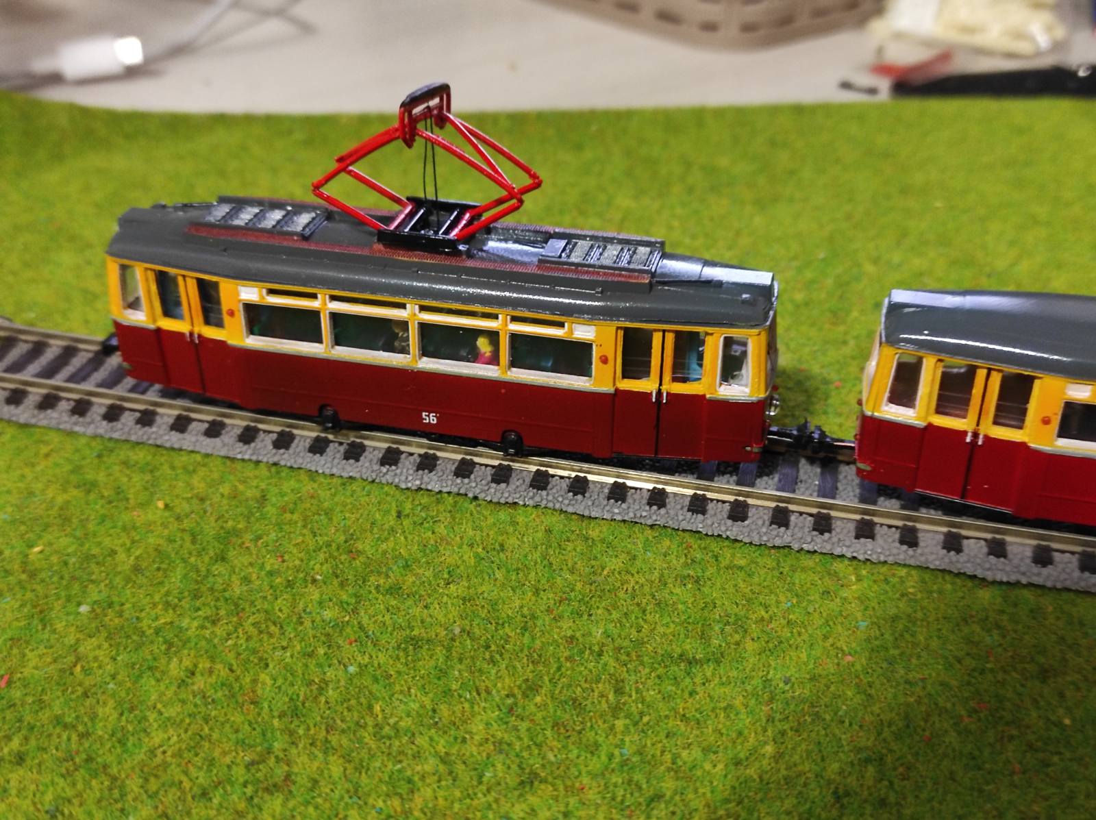 Спасибо! ты меня вдохновил своими и я решил капитально его изменить но еще недоделана пружина посередине пантграфа внизу хочу настоящую поставить и подкрасить натяжные пружинки на самом пантографе я их пока красным цветом все задул )) надо будет подчернить немного. К стати пантограф посередине я разрезал - и сделал ушки и штыри чтоб он смог немного опускаться