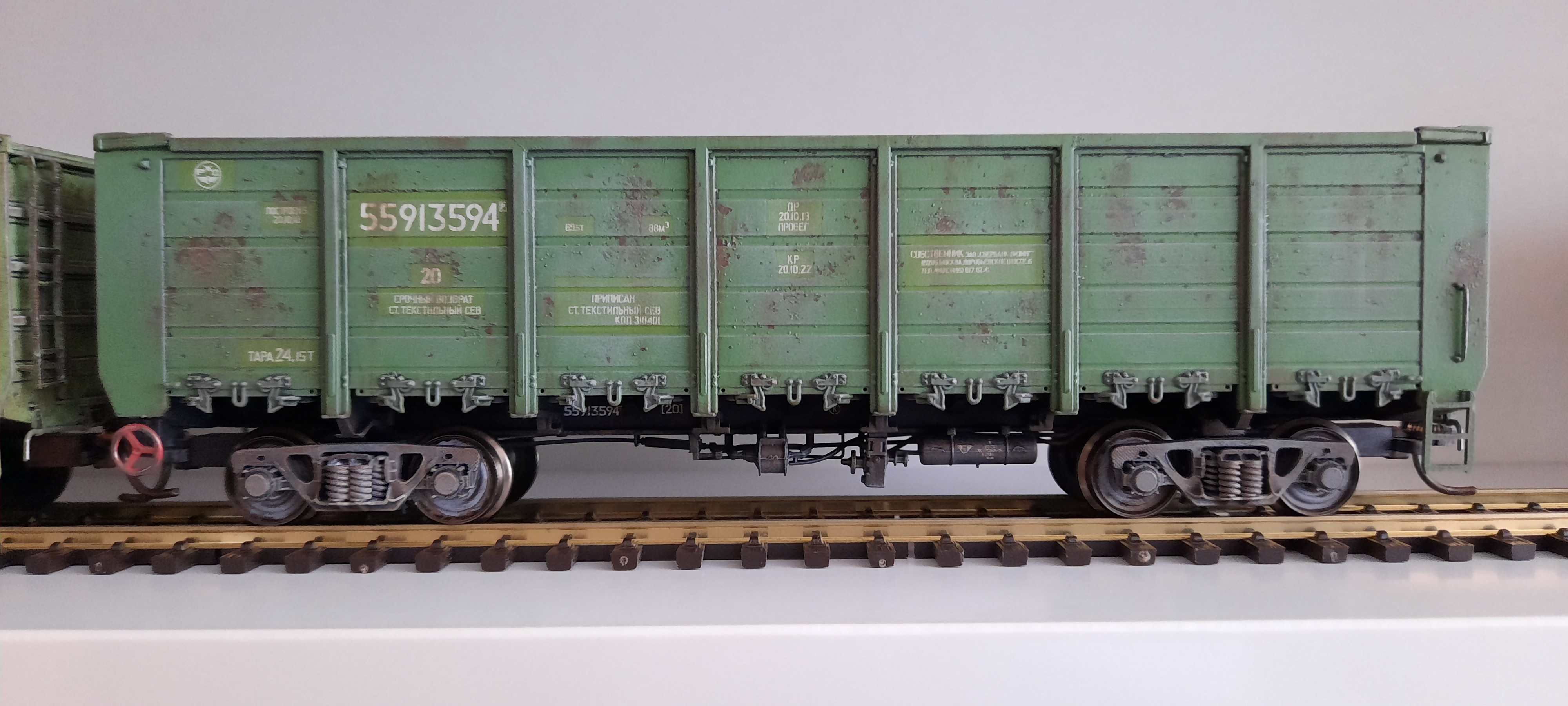 Это восхитительный результат. Эффект выгоревшей краски, разность оттенков зелёного на разных вагонах и разная степень старения очень придают реализма. Смотрится бомбезно. Однозначно заразил идеей. Ещё бы раз разложить техпроцесс по полочкам со скринами этапов и применяемых материалов...