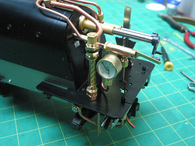 И я про те же ручки. На фото видно, что на специально удлиненные штоки регулятора и крана сифона любители ставят привод серводвигателя. Такой же привод установлен на реверс. Получается дистанционное управление скоростью и направлением движения. Бывает еще привод свистка и продувочных кранов цилиндров, но это при наличии места в модели. Все-таки эти электрические штуки довольно объемные.