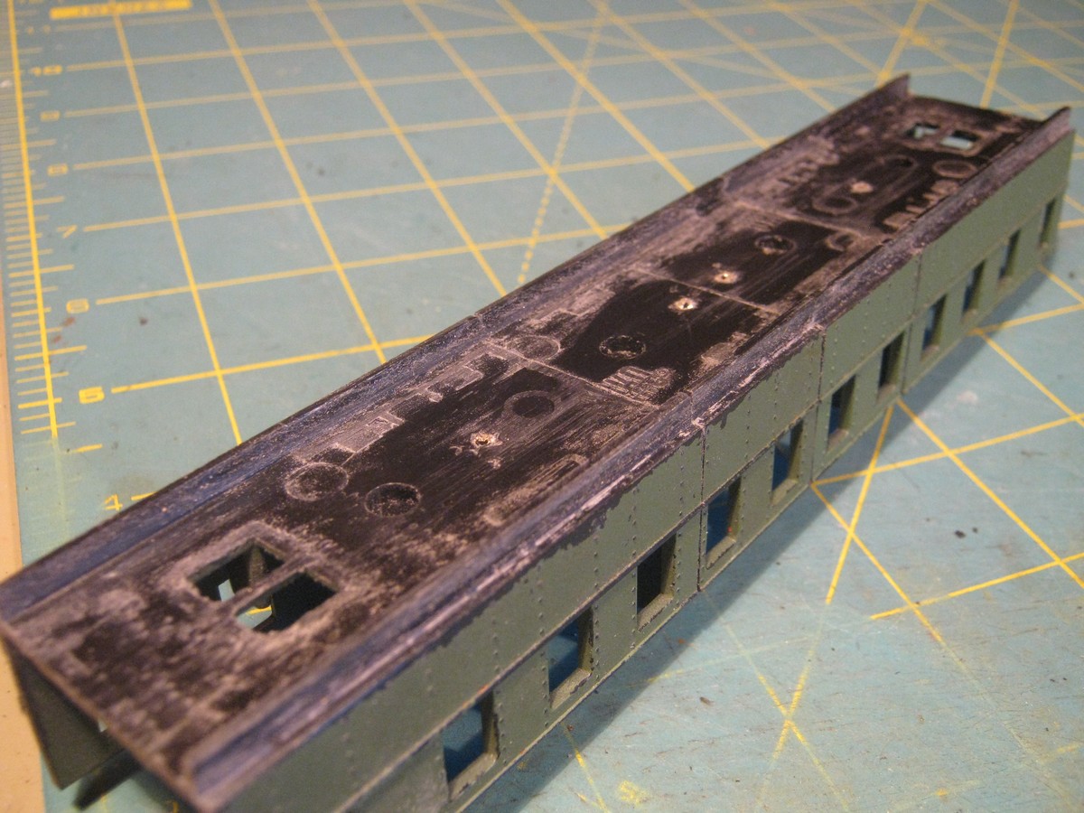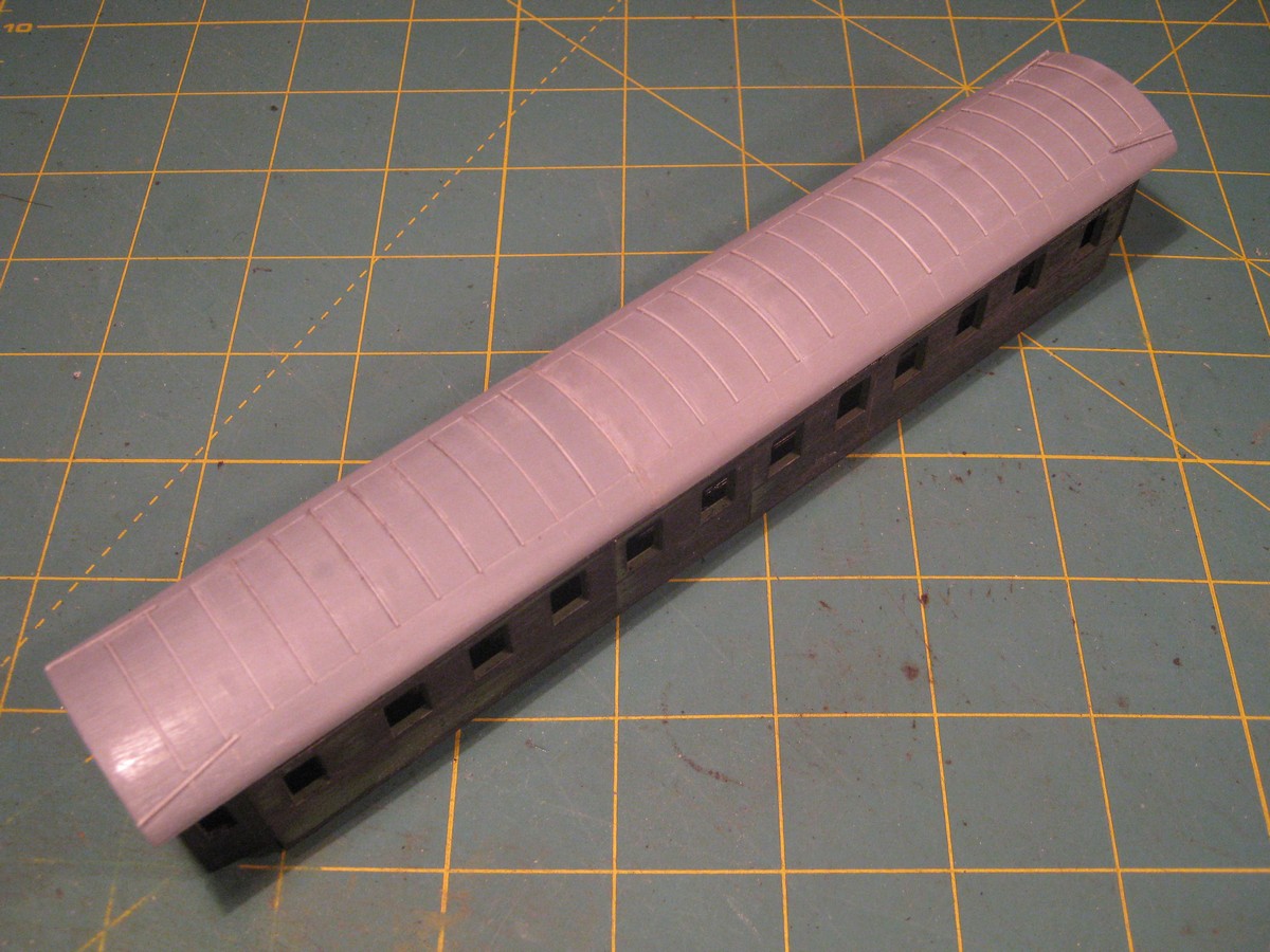 Вот несколько фотографий из сентября 2011. Я тогда только-что в очередной раз вернулся в ЖД моделизм и пилил из двух семиоконников упоминаемый здесь вагон с четырнадцатью окнами на борту. Даю фотографии именно по крыше.