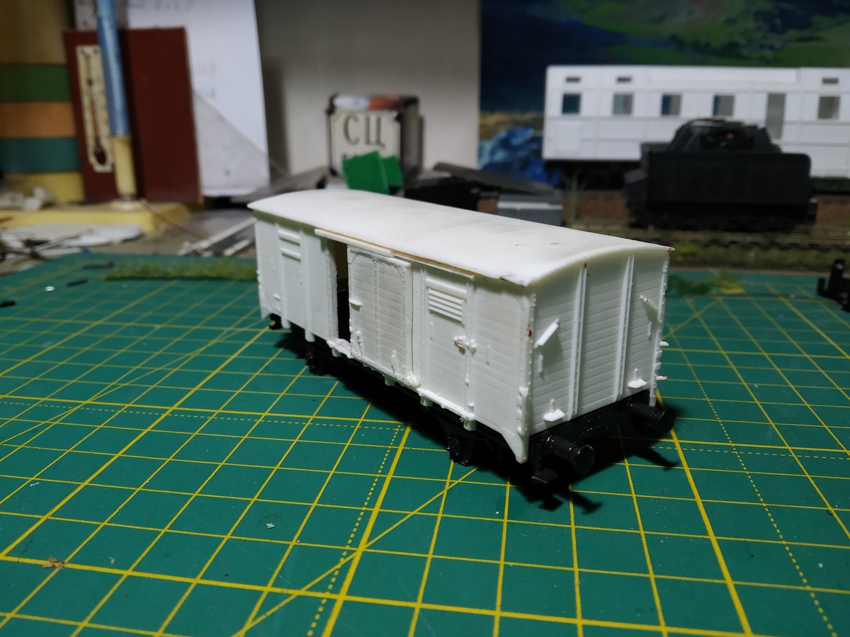 Полагаю, крышу надо покрасить в чёрный и установить дымоход. Вычитал, что вагоны ПМС обогревались буржуйками или электро. Логично предположить, что в моей эпохе III-А приоритет имели буржуйки.