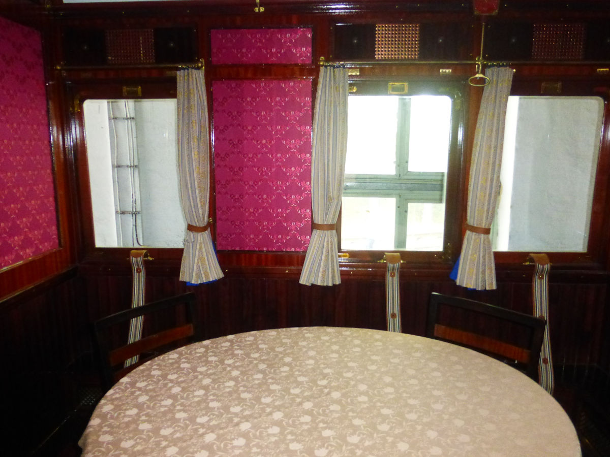 Весь же остальной "салон" по сравнению с вагонами, что стоят в Киеве в музее, вызывает ощущение доморощенности, не взирая на дубовую отделку, и какой-то деревенской тесноты: из середины зала через торцевое остекление и тамбур (!) видна зелень следующего вагона...