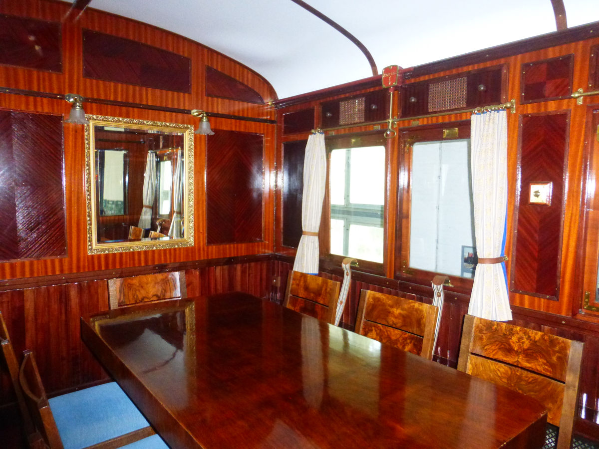 Весь же остальной "салон" по сравнению с вагонами, что стоят в Киеве в музее, вызывает ощущение доморощенности, не взирая на дубовую отделку, и какой-то деревенской тесноты: из середины зала через торцевое остекление и тамбур (!) видна зелень следующего вагона...