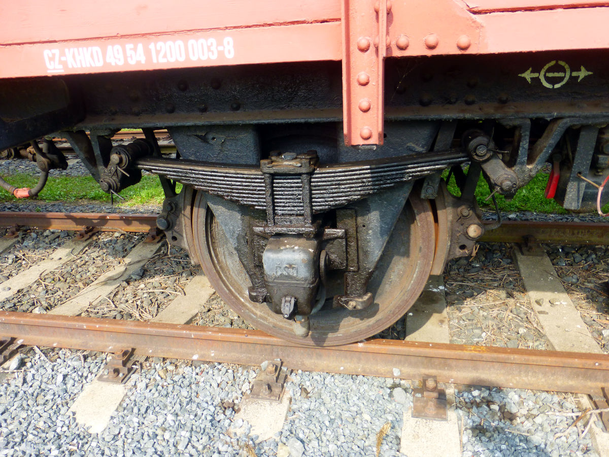 Один - в состоянии рухляди (замечено, что такую "рухлядь" чехи вполне за год доводят до состояния "только с завода", так что, возможно, вагон уже в нормальном состоянии на экспозиции). Вагон за свою жизнь явно виды видывал, механизм тормоза гнутый. По счастью, родной, никаких автотормозов не привесили (а могли - в Лужне стоят таким образом "доработанные" вагоны)