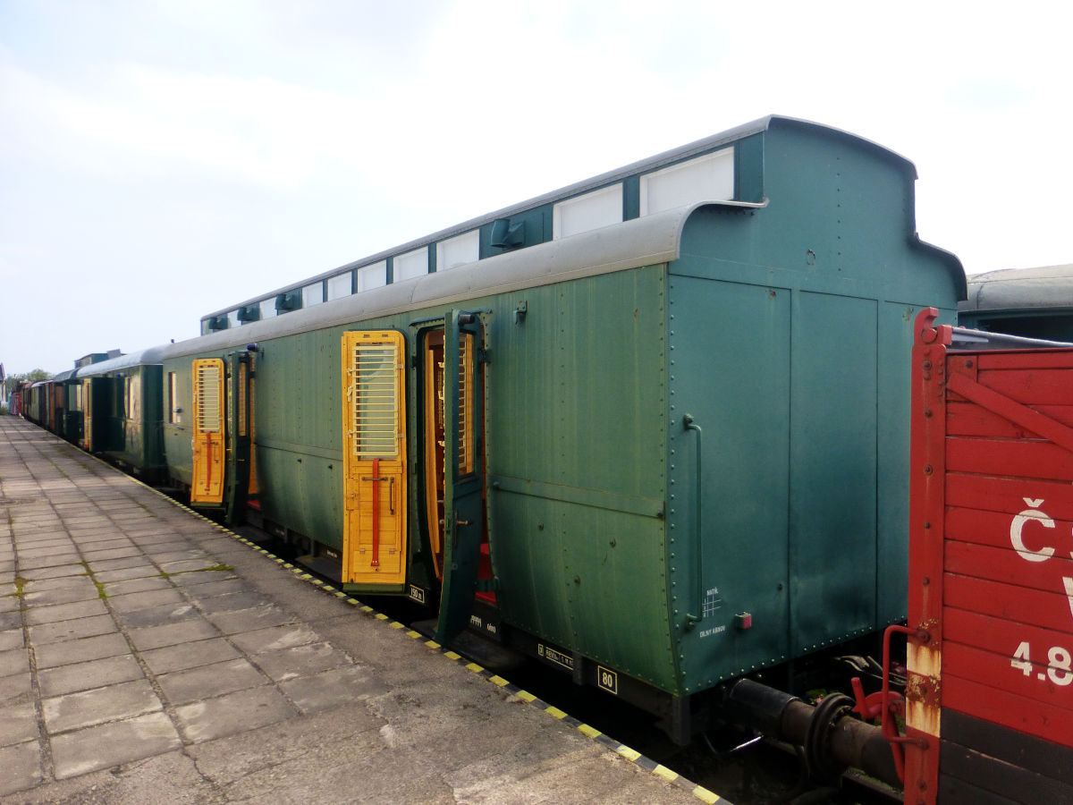 1) Багажный вагон с корпусом каретного типа. Интереснейший экспонат, но таблички возле него не оказалось... ...и что там внутри, обратите внимание на форму стенок и количество света, которое дает остекление на крыше! 2) Почтово-багажный вагон типа "Рыбак". К слову сказать, пробегали такие вагоны по Чехословакии довольно долго, аж по самый конец 70-х