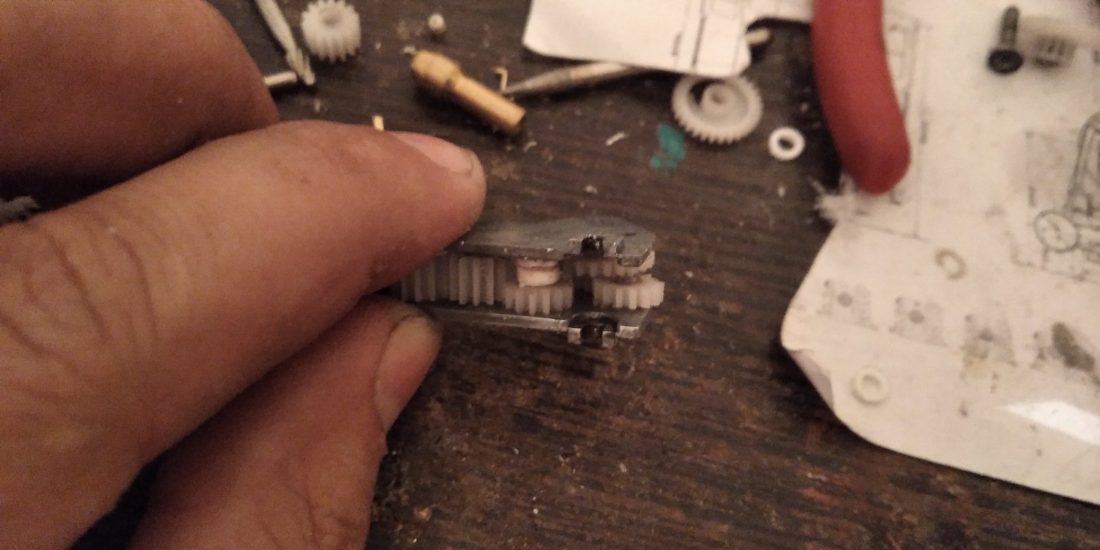 Также заменил родные красные шестерни (увы почему-то в хламофотках фото не осталось), на идентичные китайские, с той лишь разницей, что китайци чуть крупнее. На самом деле какие стоят в промежностях, значения нету. Основная идея заключалась, чтобы увеличить передачу с двига на оси не просверливая отверстия. Шестерни подобрал таки и сделал не так как в родном редукторе (внизу справа редуктор идентичный родному), все шестерни прямые.