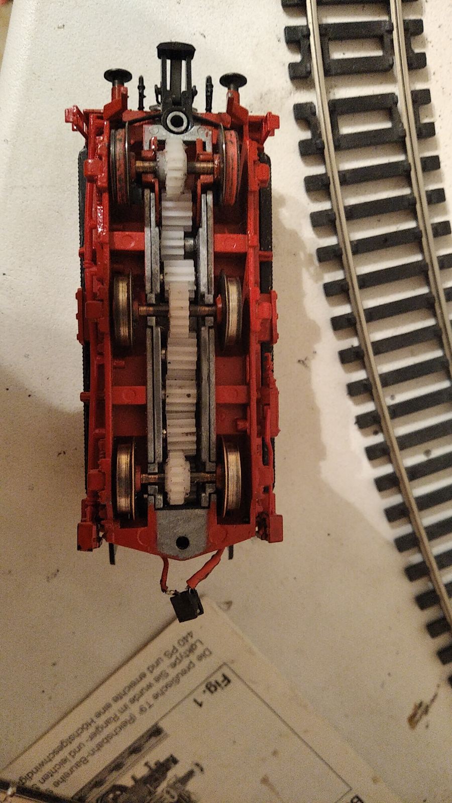 Фото уже с мотором и основное, наиболее понятное фото спереди, сути переделки. Однако пришлось таки подточить крышку тендера, мотор влез, а вот плата не совсем. Родные шестерни и мотор коробок. А модель на полочку.