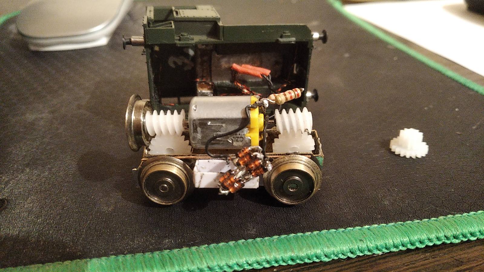 Также доделаны все накладные и отсутствующие детали на корпусе пластикового Piko. От себя добавлю, что совсем малый ход не вышел, причина банальна, двигатель, он оказался очень слаб, а отсутствие нормального червячного вала дало свой результат. В итоге стартовал резко но потом переходил на более плавное движение. К сожалению модель у меня не сохранилась, забрал один из знакомых, стоять светится в депо, так как свет включался до начала движения мотора.