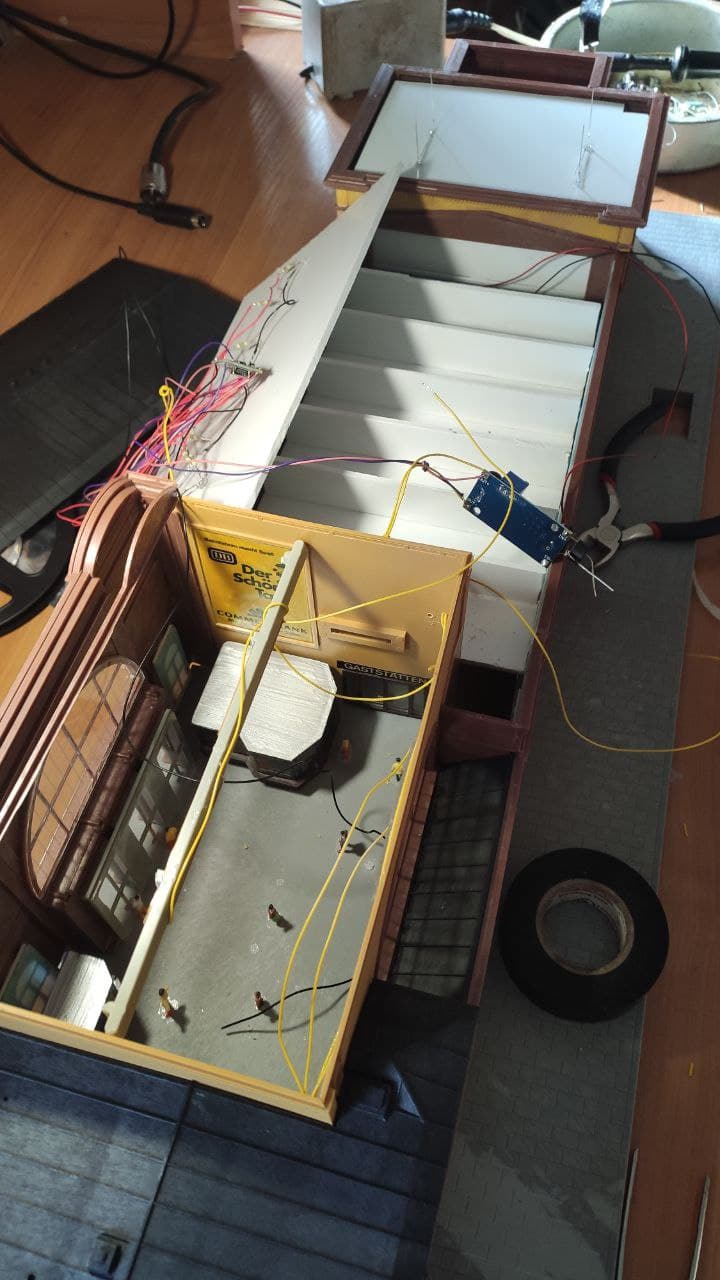 Було прийнято рішення освітити не тільки перший поверх, але й другий теж. Так як на вокзалі статично світяться перони, приміщення вокзалу; другий поверх мав бути трохи "іншим". Вирішив розділити кімнати перегородками і підвести до кожного світлодіода окреме живлення від Ардуіно.