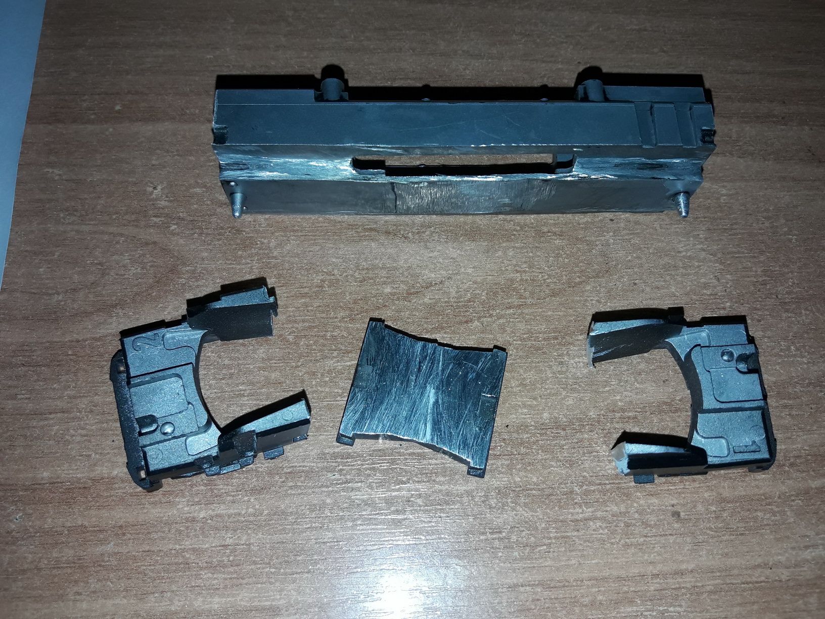 Итак, ходовая. Ввиду одинаковых тележек и базы с М62 вопрос о доноре очевиден. Решил оспользовать не только тележки и двигатель, но и раму рокомашки. Для этого с помощью инструмента типа "болгарка" с неё были убраны топливный бак и законцовки вплотную до шкворней. С нижних продолных граней был убран металл настолько, чтоб конструкция вошла в паз рамы ТЭ3. С самой рамы тэ3 убраны продольные перегородки. Подогнал, закрепил эпоксидкой. Двигатель немного не достигает дна своего паза, становится чуть выше, на 1 мм примерно, но на ходовые качества это не влияет. После сборки проверил, ходовые качества отличные (впрочем, неудивительно, фактически это кинематически неизмененная ходовка рокомашки). Только из-за особеннойстей рамы ТЭ3 ходовка больше не вписывается в радиус R2 (что для меня, мягко говоря, некритично, лично я считаю, что R2 для тех, у кого ну совсем уж плохо со свободным местом. Я и от R3 ухожу в сторону R4 и R5). Далі буде...