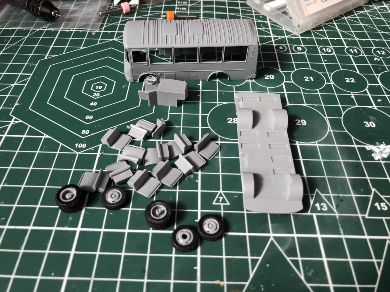 Всем приветы, пазик дособирал, осталось по мелочи, зеркала с дворниками вклеить, номера нарисовать и напечатать.., но пока этого делать не буду, решил сделать диораму. Теперь буду ждать лазерную резку от Сергея Черевченко.