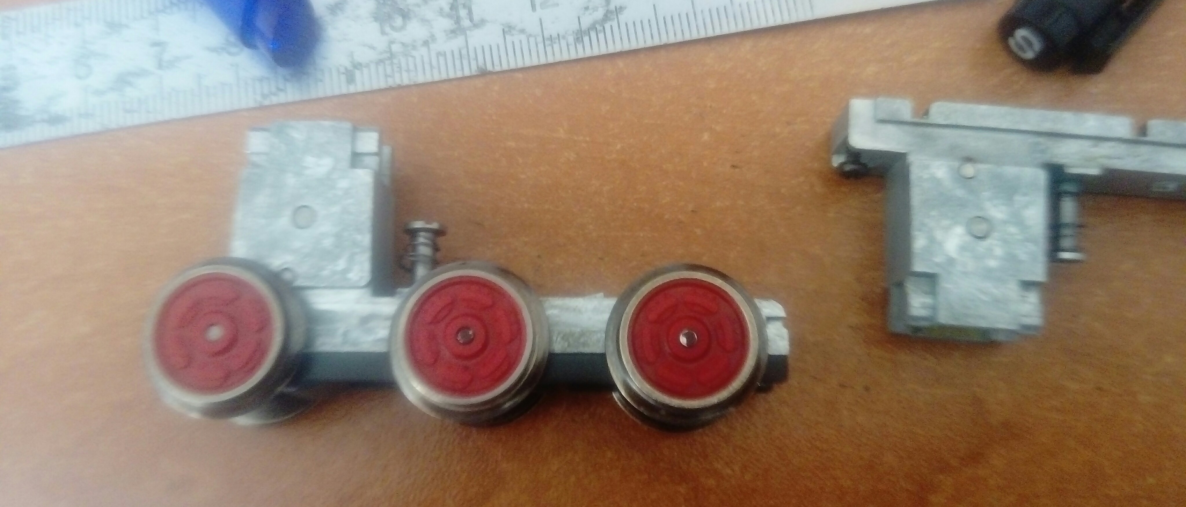 Итак, тележки. Тут товарищи недавно делали заказ запчастей на Роко, ну и я заодно заказал две тележки - пустышки (корпус, крышка и поддон) от нового Е103 (семидесятитысячные артикулы). Сегодня мне товарищ продал две тележки от "среднего" е103, то есть от шестидесятитысячных артикулов. Ранние тележки, то есть сорокотысячняки, идентичны 60 000, но только до крайней оси не довели шестерни.