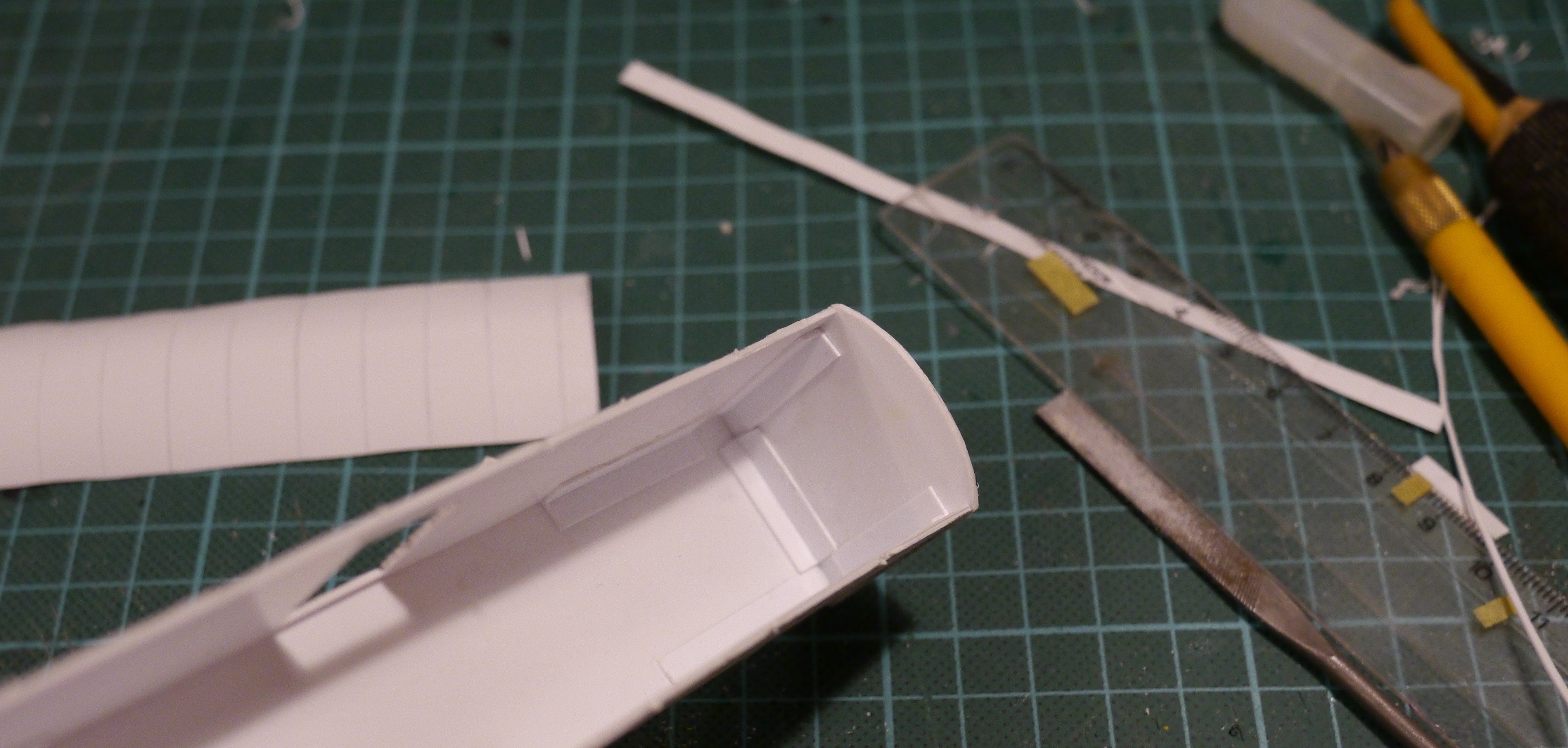 Суть проблемы такова. Крыша у вагона не плоская, а покатая. Теоретически можно изогнуть лист тонкого полистирола, приклеить, держать пока не подсохнет (или как-то зафиксировать в нужном положении). И в принципе получится. Но со временем есть немаленький шанс, что крышу покоробит. Насколько я понимаю, пластик пытается вернуться к старой форме (плоской) и склеенная конструкция все время в напряжении. Значит, надо, чтобы полистирол "запомнил" новую форму. Как это сделать - подсказал Денис ака Stinky, когда крутил котлы для цистерн.