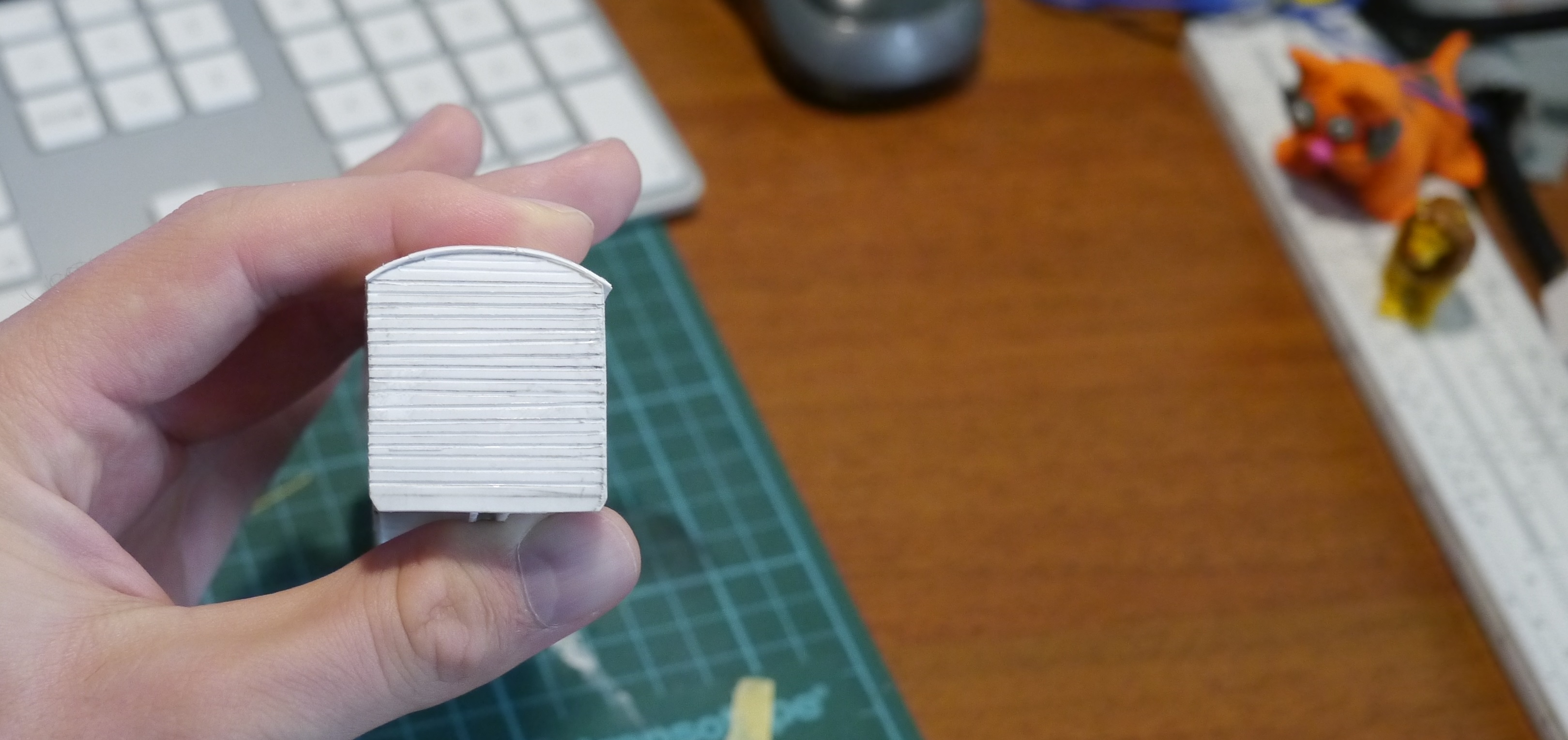 Итак, вырезаю крышевую деталь (с предварительно "расшитыми" панелями) и крепко приматываю малярным скотчем к трубке из толстого картона.