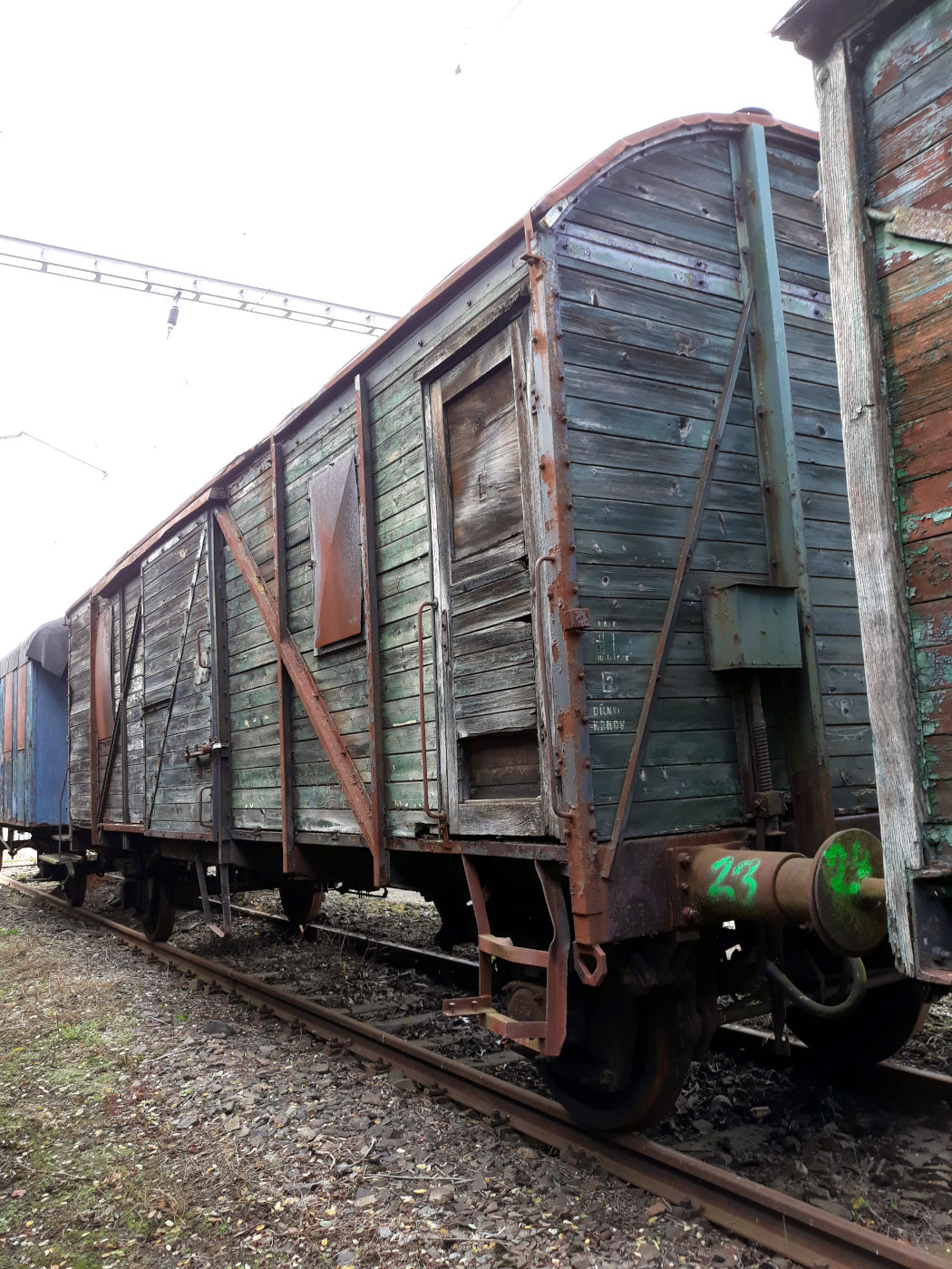 Все приведенные ниже фотографии относятся к вагону, который находится на станции Велке Бржезно (Velké Březno), Устецкий край, Чехия, и принадлежит музею Зубрнице, ремонтно-техническая база которого находится в Велке Бржезно. Вагон, который удалось осмотреть, - военных лет постройки (характерная диагональная планка на двери), стоит в составе ожидающего реставрацци хлама. Привожу фото вагона в надежде, что кому-нибудь они поригодятся для работы с моделью. К слову, модель подобного вагона анонсирована Роко на III квартал 2021 года.