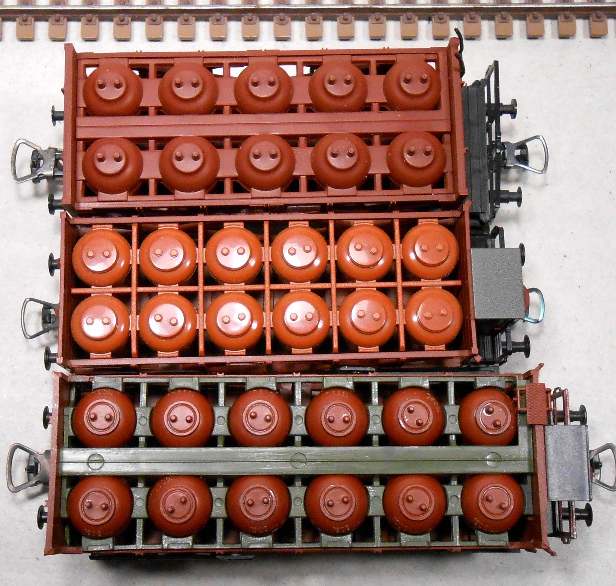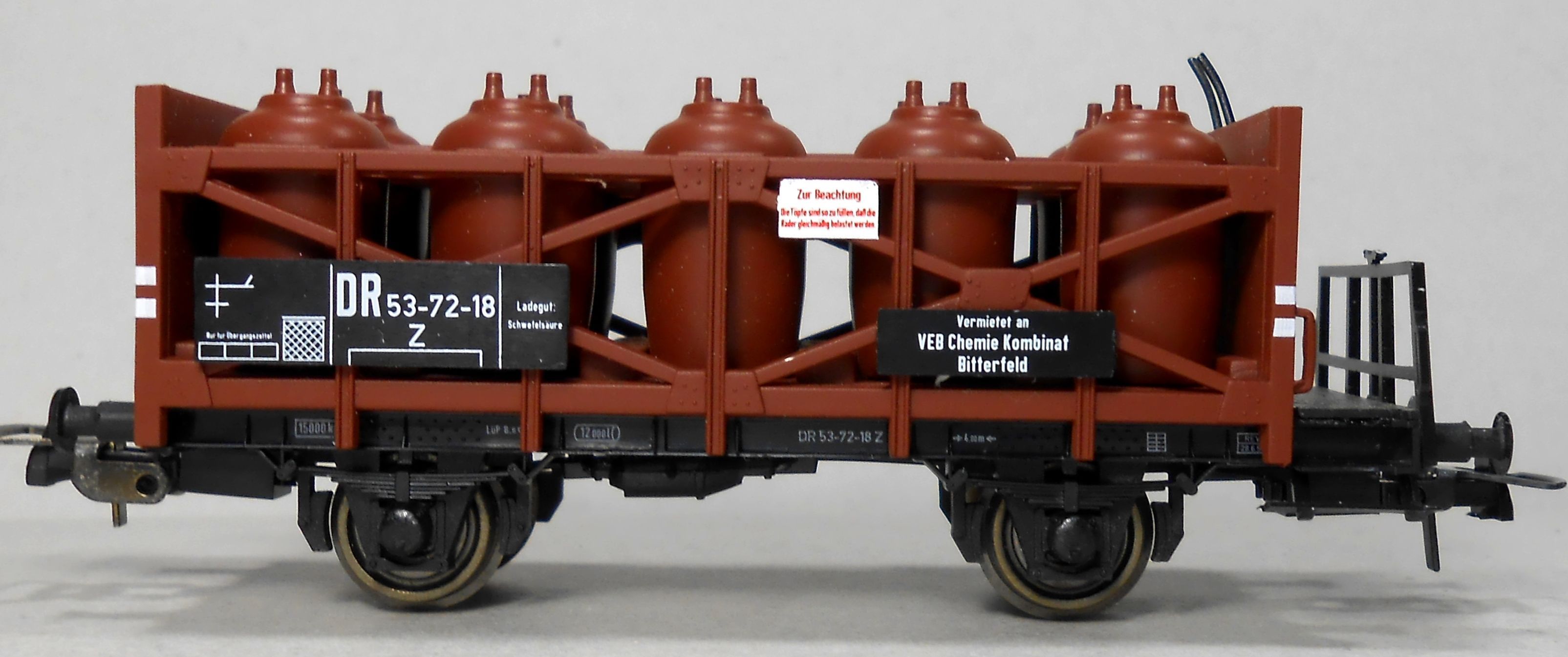 открываются все люки.Но выглядит он уже пидстаркувато,по сравнению с новоделом. Еще вагон для перевозки кислоты в керамгоршках.От Заксена. Конструктив невиданный мной доселе ,ибо там 10 бочек,а вагон такой же как на 12.