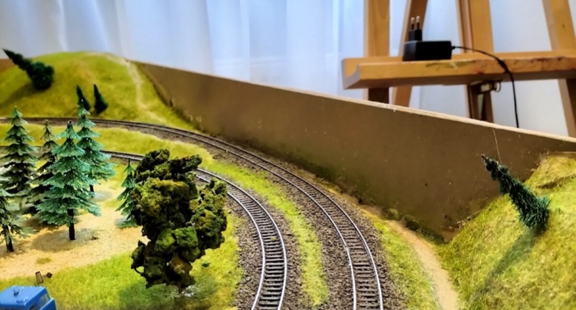 По траві - вона в принципі стирчить, але стирчить в різні сторони, її би причесати чимось. Між коліями вийшло не дуже - я сипав там дрібну у 2-3мм, а воно змішалося в кашу з клеєм. А ялиночки Vero це класика, ялиночок ще треба в треба буде.