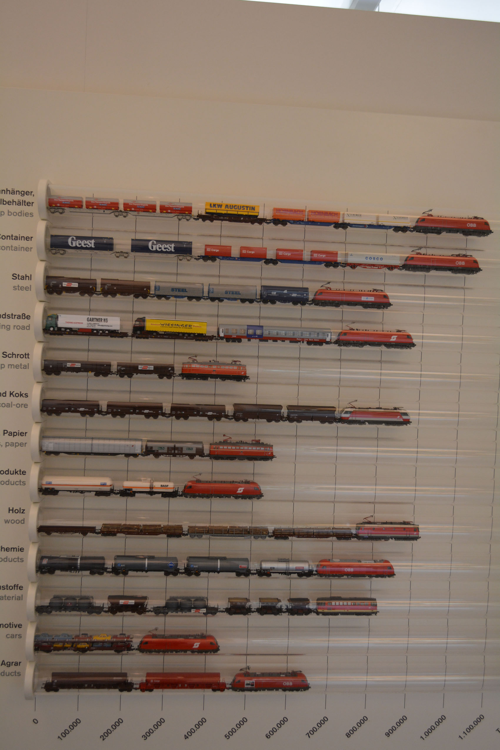 Инсталляция с примерами вагонов по типам грузов интересная с точки зрения компоновки составов. Вагоны разных поколений рядом...