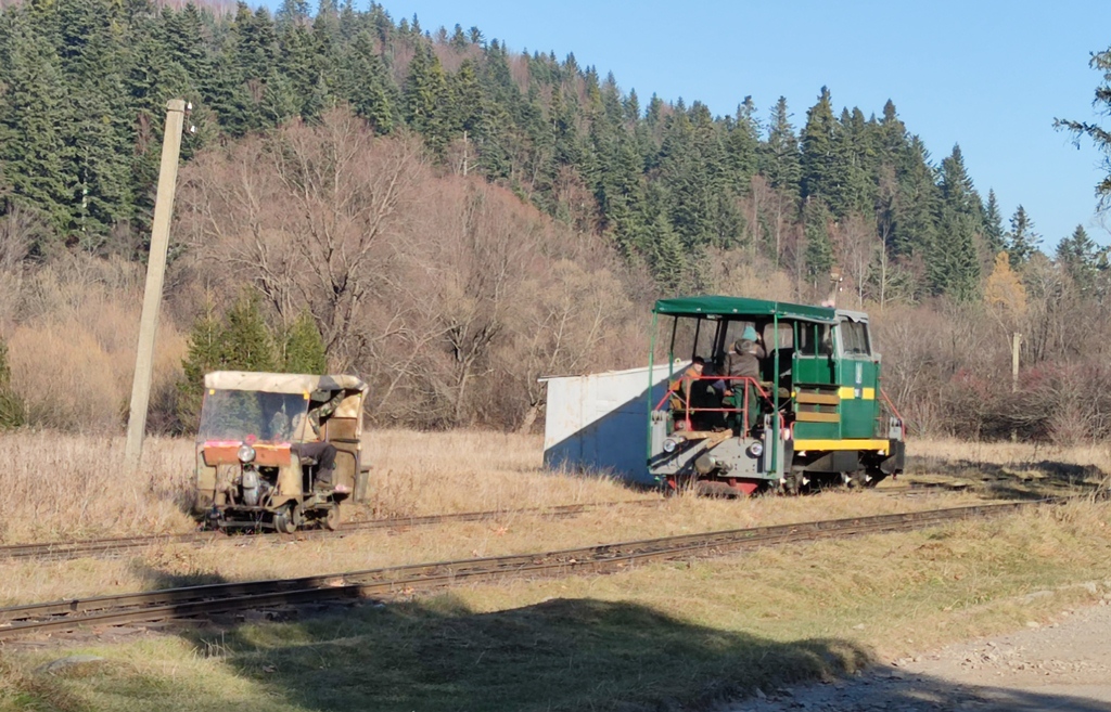 Но зато на обратном пути на остановке возле заброшенного санатория "Карпатське джерело" увидел очень интересный пепелац. Он следовал сразу за тепловозом ТУ8Г. Тепловоз поехал дальше в Выгоду, а машинист (?) пепелаца остановился, вручную переставил его перпендикулярно на другие рельсы и загнал в гараж. Назвать это сооружение депо как-то язык не поворачивается...