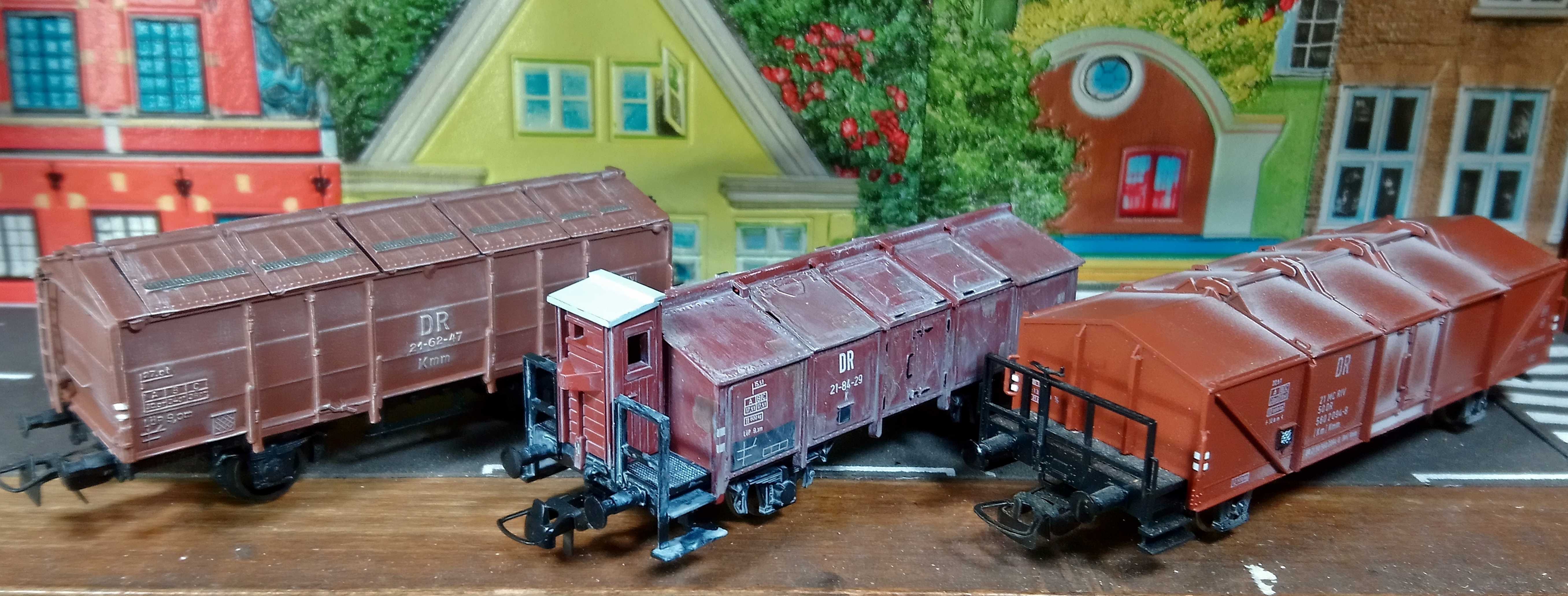 Здесь видно три метода.Слева направо по каждому вагону:сухая кисть,заливка серой краской,аэр.