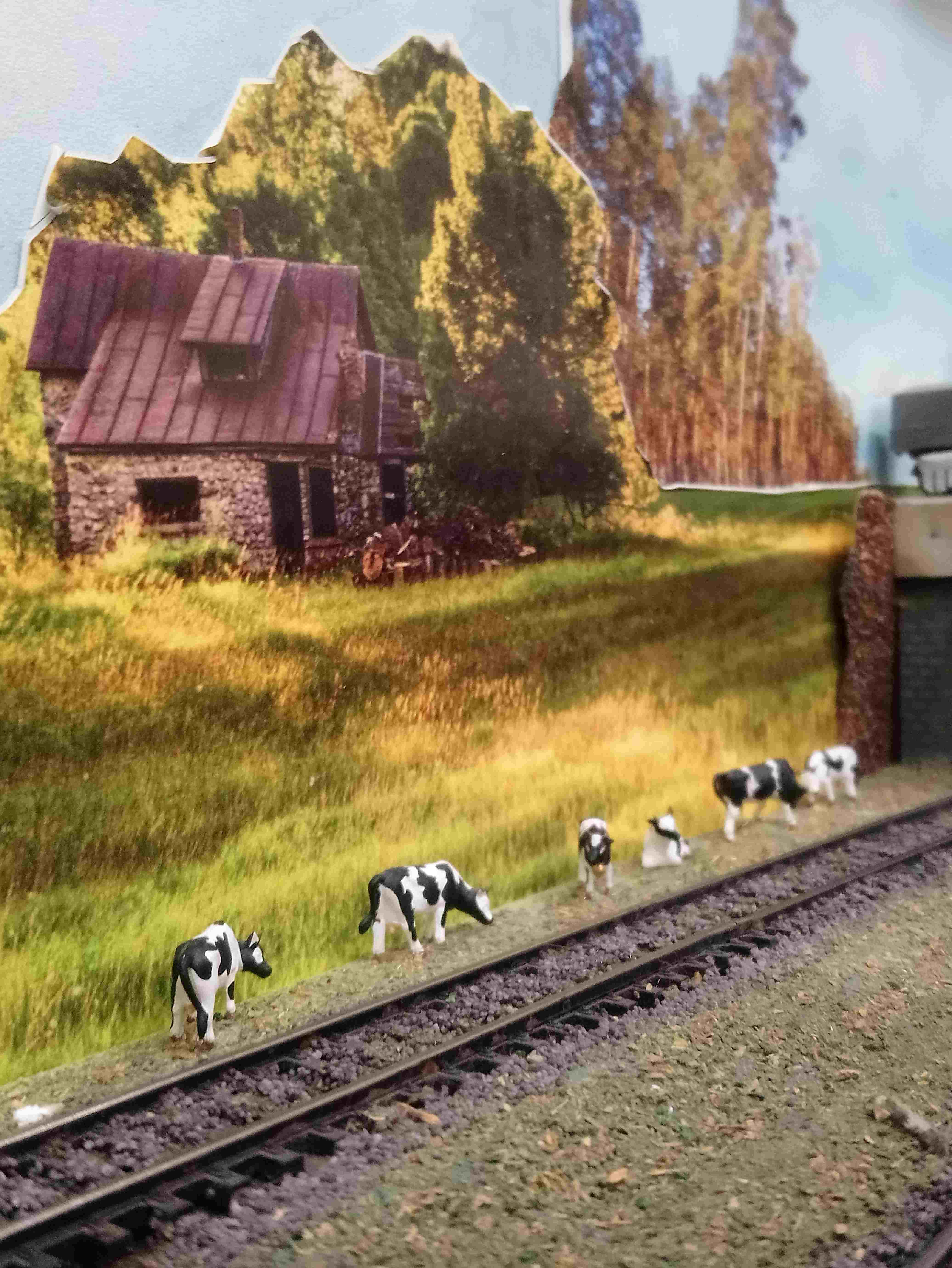 На заднем фоне в виде поля,рядом с путями удалось разместить небольшое стадо.На удалении