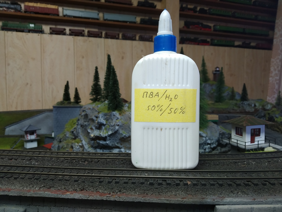 Перед заливкой смочил из распылителя. Что касается раствора ПВА, то спецы обычно проливают шприцом, но я дилетант и вообще по всем этим вопросам у меня есть своя точка зрения. В общем, лил из пузырька для клея ёмкостью 200 мл. Вылил примерно 100 мл.
