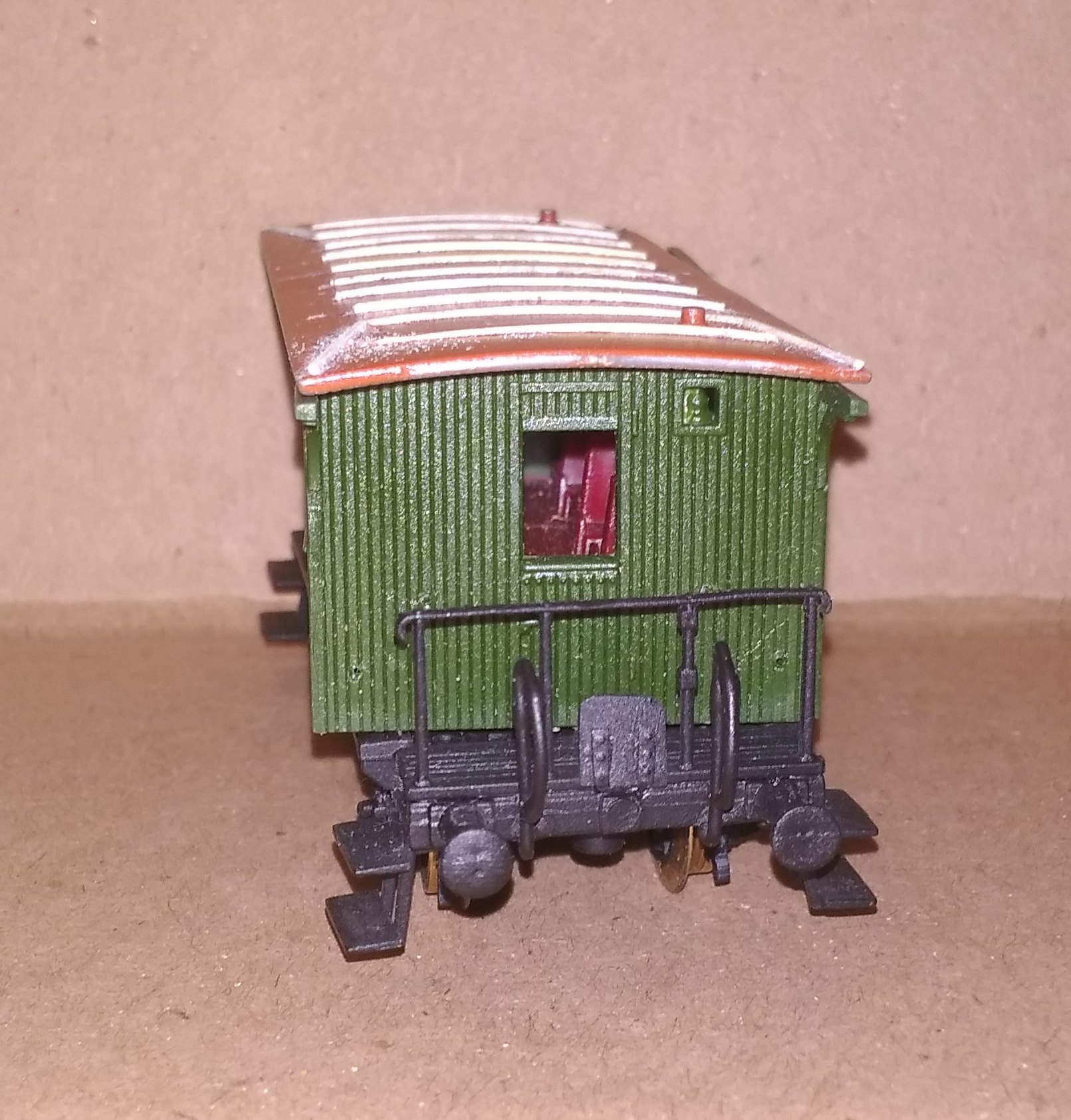 Собрал по временной схеме покраску. Решил. что крыша должна быть потемнее, чем раньше. Заодно задул интерьер тёмно-желтой краской. Вроде неплохо получилось. Думаю, стенки вагона покрасить более яркой краской, не такой темо-зеленой.