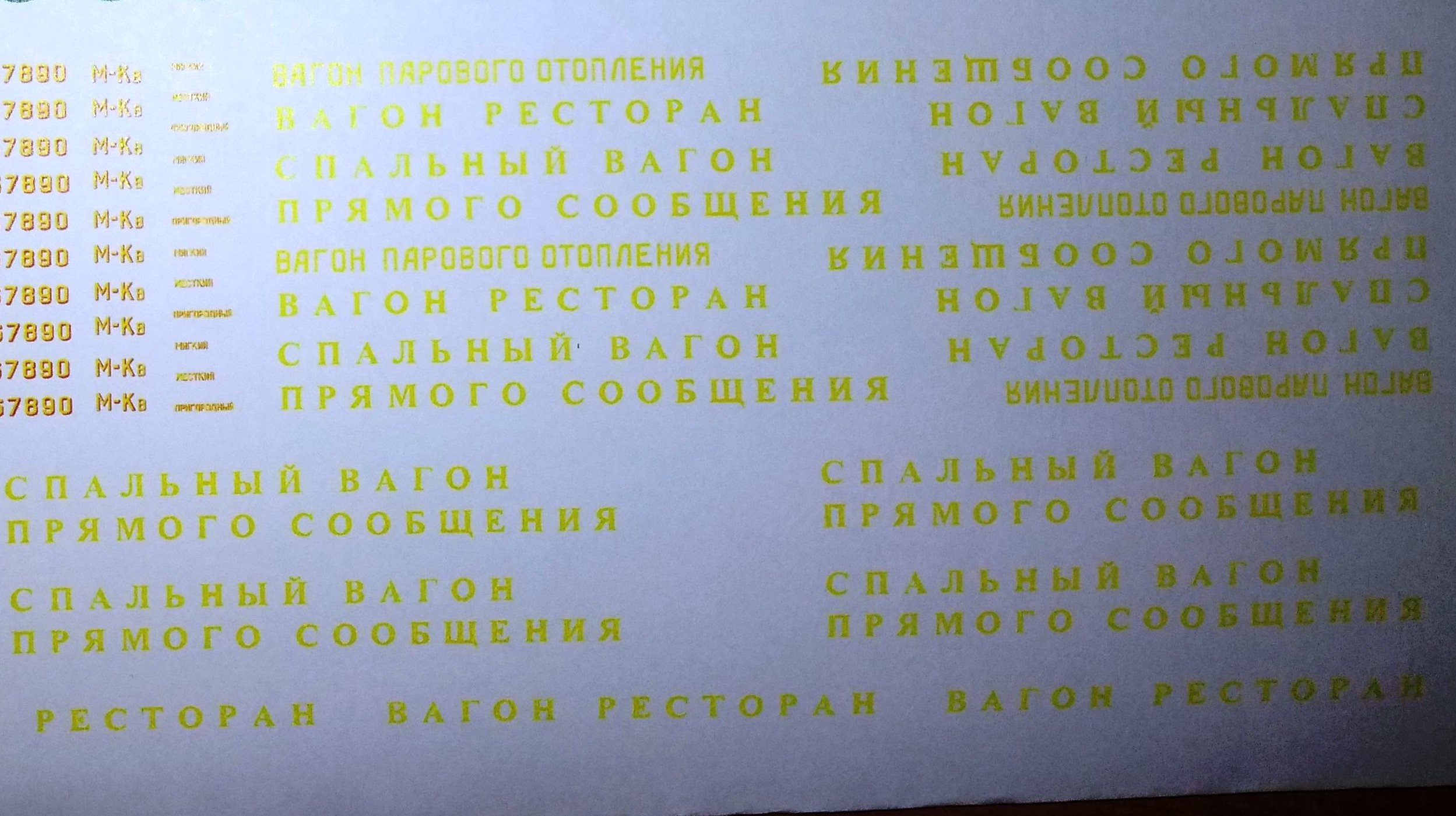 Пока перерыв, связаный с покраской, решил заняться деками. Сделал прорисовки надписей, попробую их перенести на вагоны. Распечатка на обычном листе. К сожалению, нет на принтере белого цвета, заменил желтым. В принципе, согласно альбоиу 46г. надписи делаются желтым с красным смещением. Так что смотрите, что получилось.