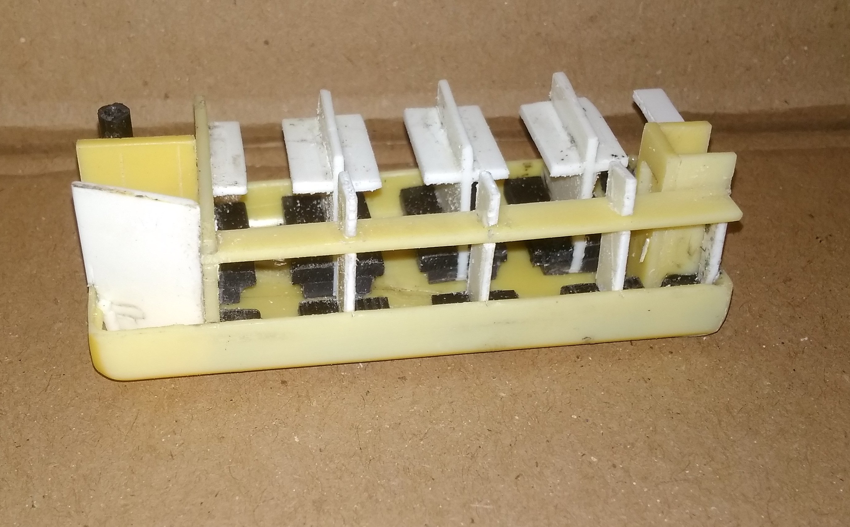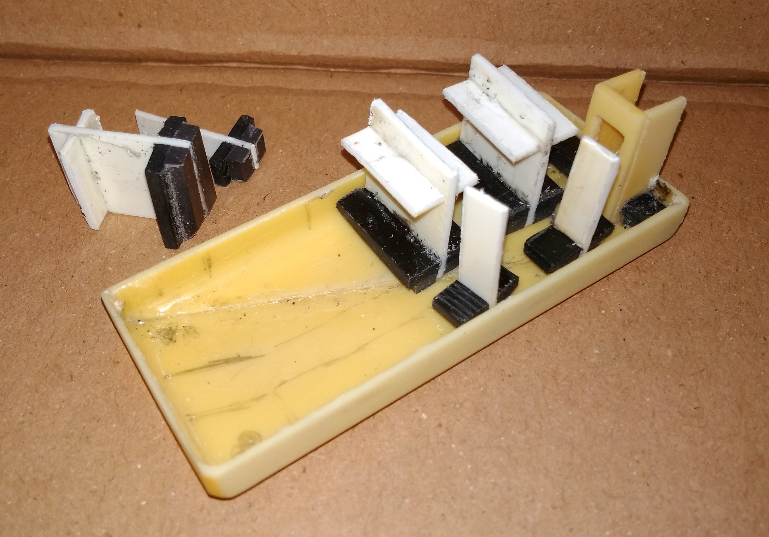 Понабирал, когда чистили кладовку от устаревшей аппаратуры. Пластик толщиной от 1 до 1,3мм. Цвета встречаются разные (голубой, желтый, красный, розовый), но в основном белый или "слоновая кость". Последний довольно хрупкий, колется при откусывании. Другие спокойно режутся ножницами. Из двух обрезанных половинок склеил "ванну" для интерьера, в которую и будут вклеиваться все детали.