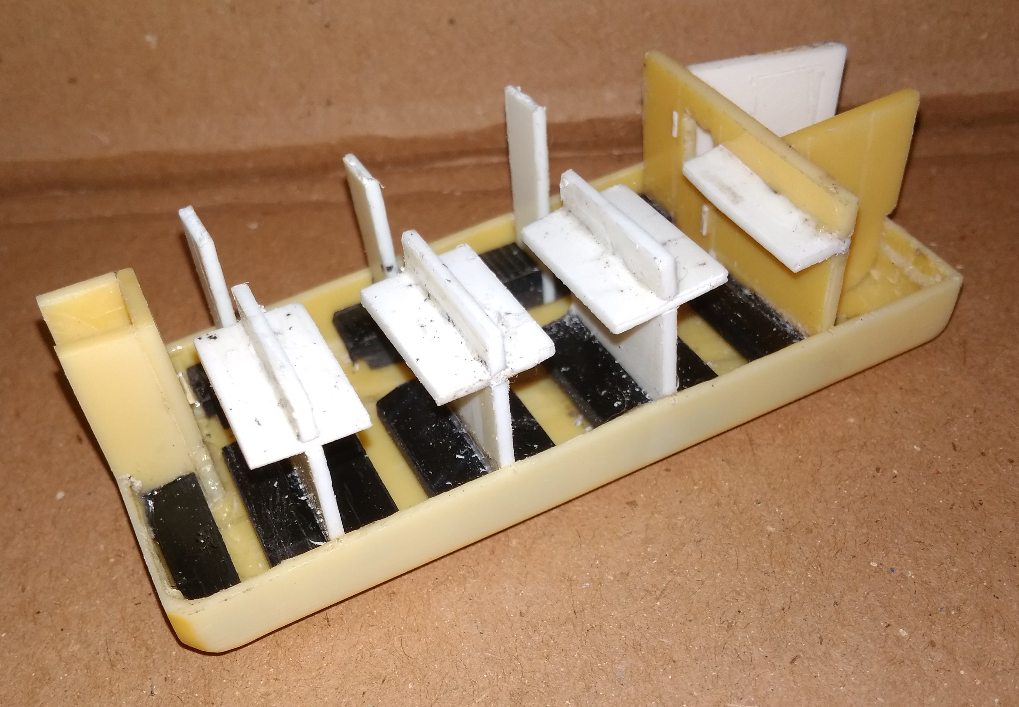 Чуть позже сделаю обзор работ по интерьеру. Дело движется, но работы ещё достаточно. Кстати, какой цвет внутренних помещений такого вагона, не подскажите? Так-то пластик белый и черный пошел в дело.