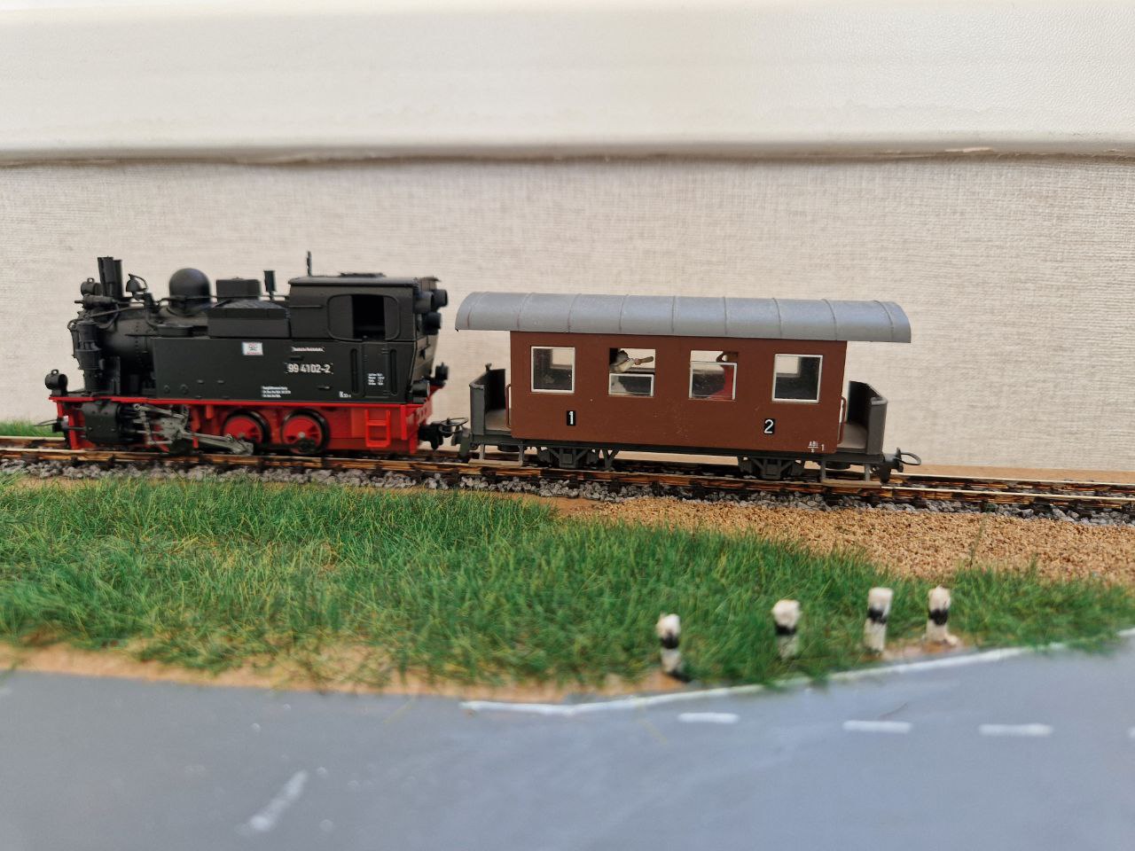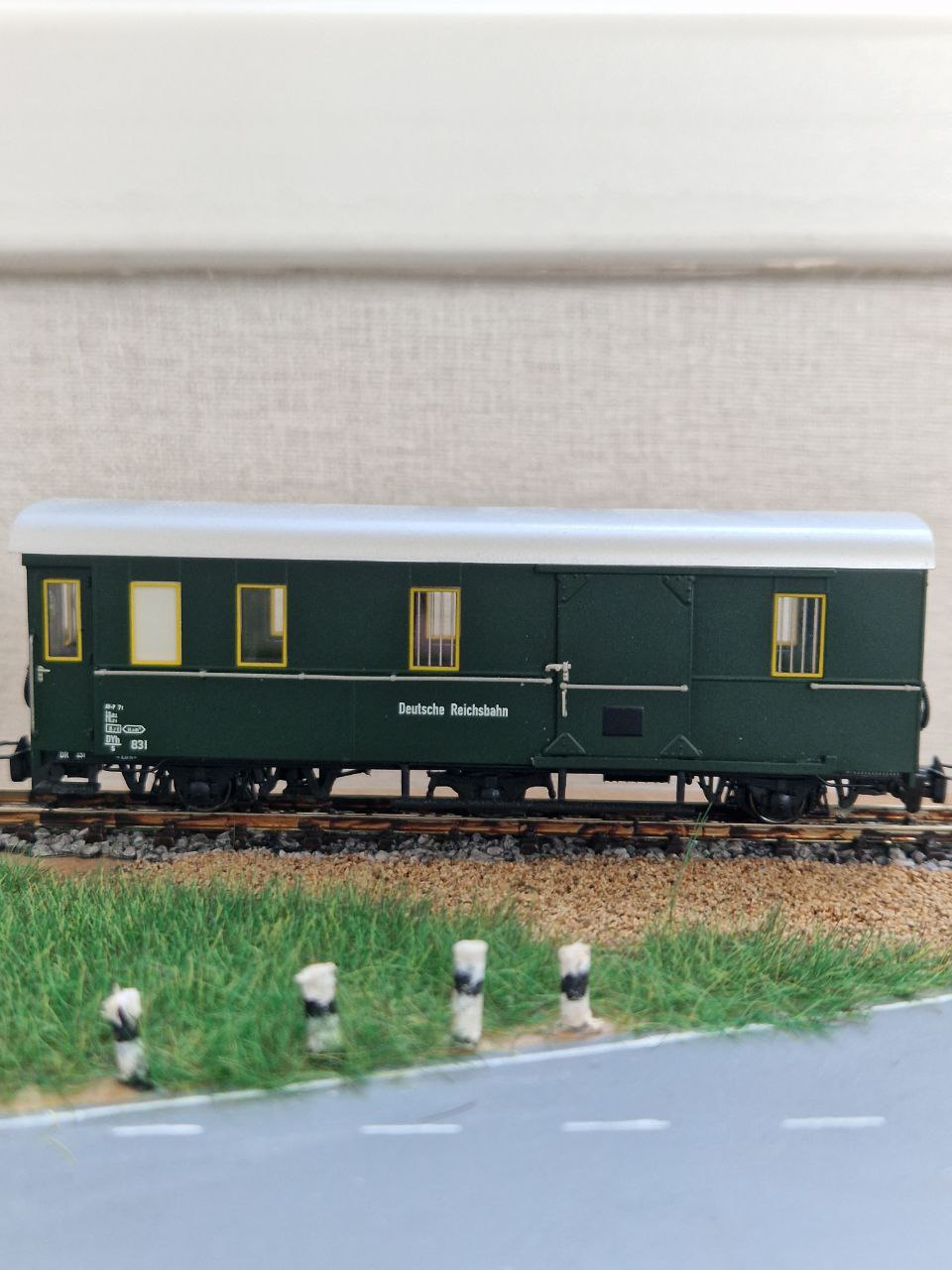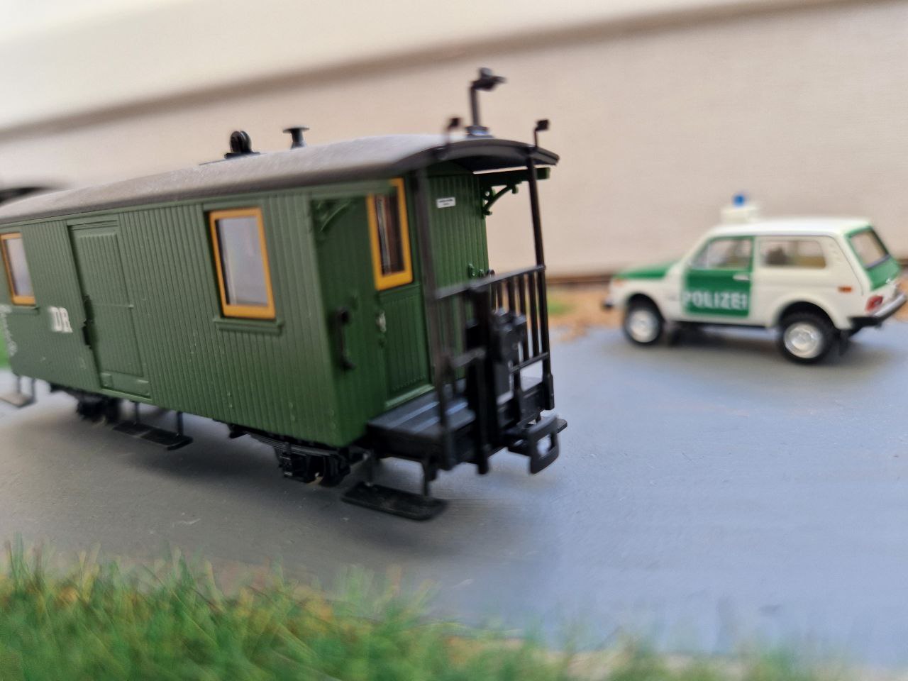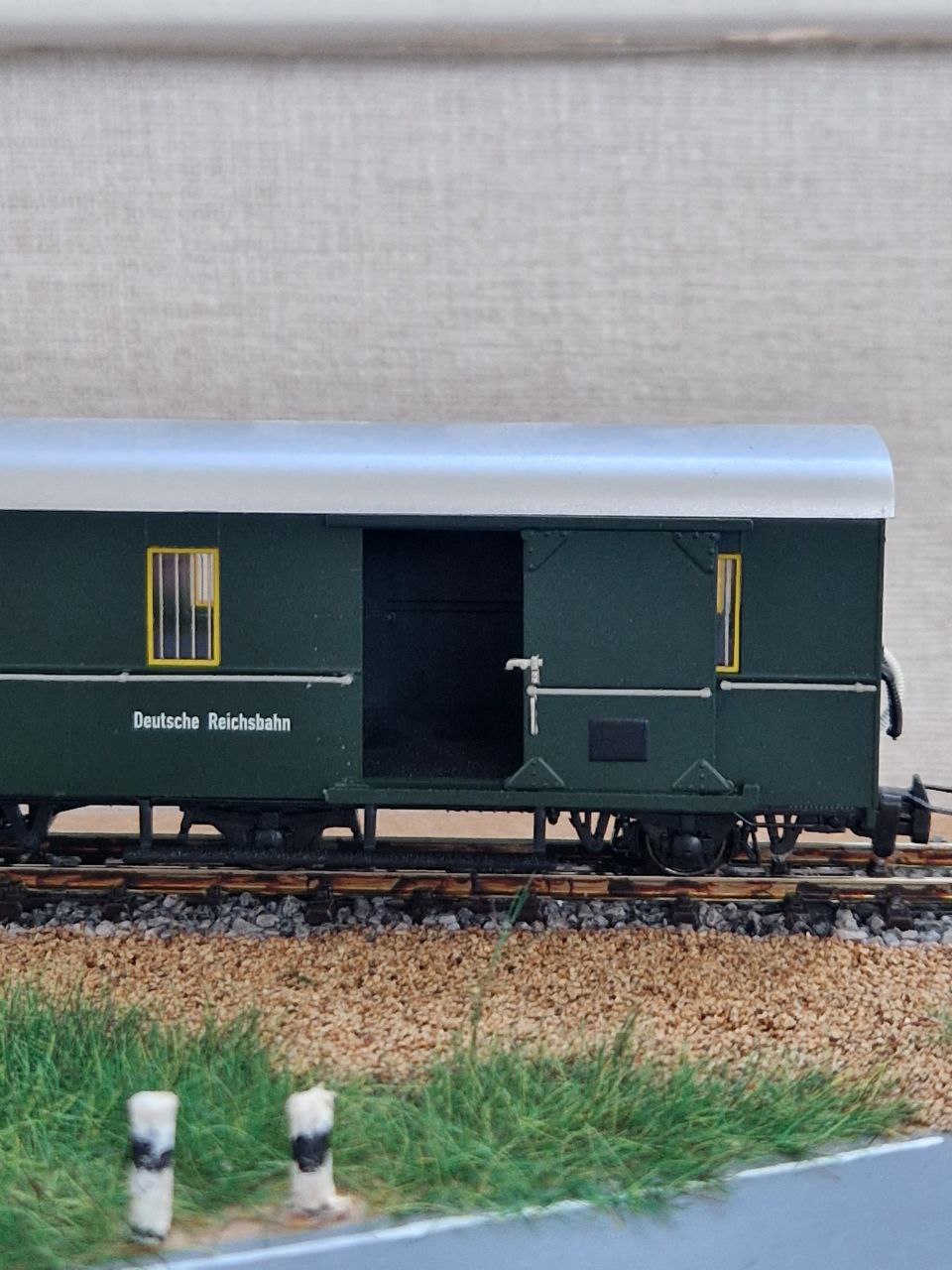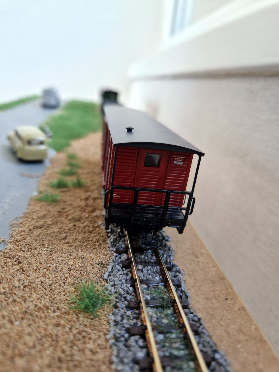 Packwagen Tillig в H0e. Трохи спробував забруднити вагон) Також усі вагони тіліг ширші за вагони від роко, та ьрохи вищі. Я так зрозумів вони буди від 1000мм.