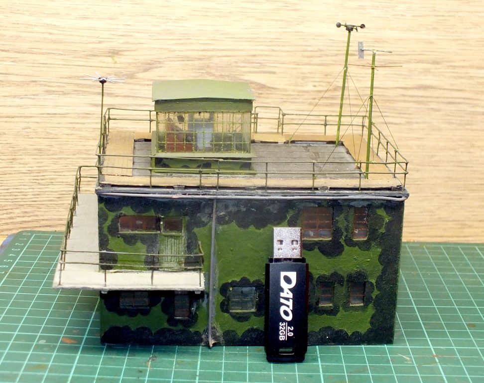 Ну поскольку ЮрСаныч весьма успешно развивает авиционную тему, я подумал - " А почему бы и нет?" и сделал "Авиационный Диспетчерский Пункт"или, более подходяще к прототипу - RAF Airfield control tower - Контрольная вышка аэродрома Королевских военно-воздушных сил Великобритании периода Второй Мировой войны.Почему вот её? - ну автожир Сиервы есть, а эти аппараты на первоначальном периоде войны использовали для настройки РЛС ПВО Великобритании, нужен аэродром. Начиналось всё как обычно - в сети давным - давно нашёл выкройки бумажной модели этого здания, лежали у меня в заначке, там же лежали старинные журналы "Стендмастер", издавались в 90-х годах Новосибирским клубом стендового моделизма, в одном из них была статья "Путешествие в страну RAF", метра Сибирского стенда Валерия Васильевича Сердюка. Это был рассказ о сборке ну о - о- о- очень древней пластиковой модели такой вышки от AIRFIX в хитром "английском " масштабе 1/76. (Кажется H0/00 ?) .Ну статью я изучил и предвкушал - "Щаз резаком раз - два, клеем три - четыре, краской... " Ну понятно, в общем... Так вот выкройки оказались полной копией этой пластмассы но, когда я их распечатал, учитывая масштаб, ни в куда это всё не попало....Да ещё в сеть полез посмотреть... Короче - моя модель - это полный самодел , сделанный по оригинальным чертежам проекта Министерства авиации Великобритании, спецификация 12799/41. Нарыто в сети. Модель моя и модель от AIRFIX - модели вышек построенных по разным проектам. На Аирфиксовскую я чертежей не нашёл, хотя фото таких вышек в сети есть.Основное внешнее отличие - у аирфиксовской балкон Г - образный, у моей П - образный. Теперь по модели - то что я сделал, в некоторых деталях компиляция, сделанная по фото из сети. Военных фото не так что бы густо, многие детали "крышевого" оборудования не понятны , кроме того была спецификация от 43 года и некоторые вышки перестраивались. Окраска - за основу взял широко применявшийся в начальный период войны как для техники так и для стационарных сооружений камуфляж типа "уши Майти Мауса"(!!!). Вполне официальное название , кстати... По конструкции - как там крыши крыли , чем, не нашёл, сделал по своему разумению, толем. Потому и мостки по периметру, чтоб не продавливать... "Оранжерея" на крыше - что там обычно размещалось - не нашёл, поверил реставраторам, хотя есть сомнения...Размеры, окраска и расчалки метео на крыше - примерно , толком ничего в сети нет. Антенна - такая есть на одном фото, но вот период появления-? Вообще толком по антеннам ничего не нашёл...