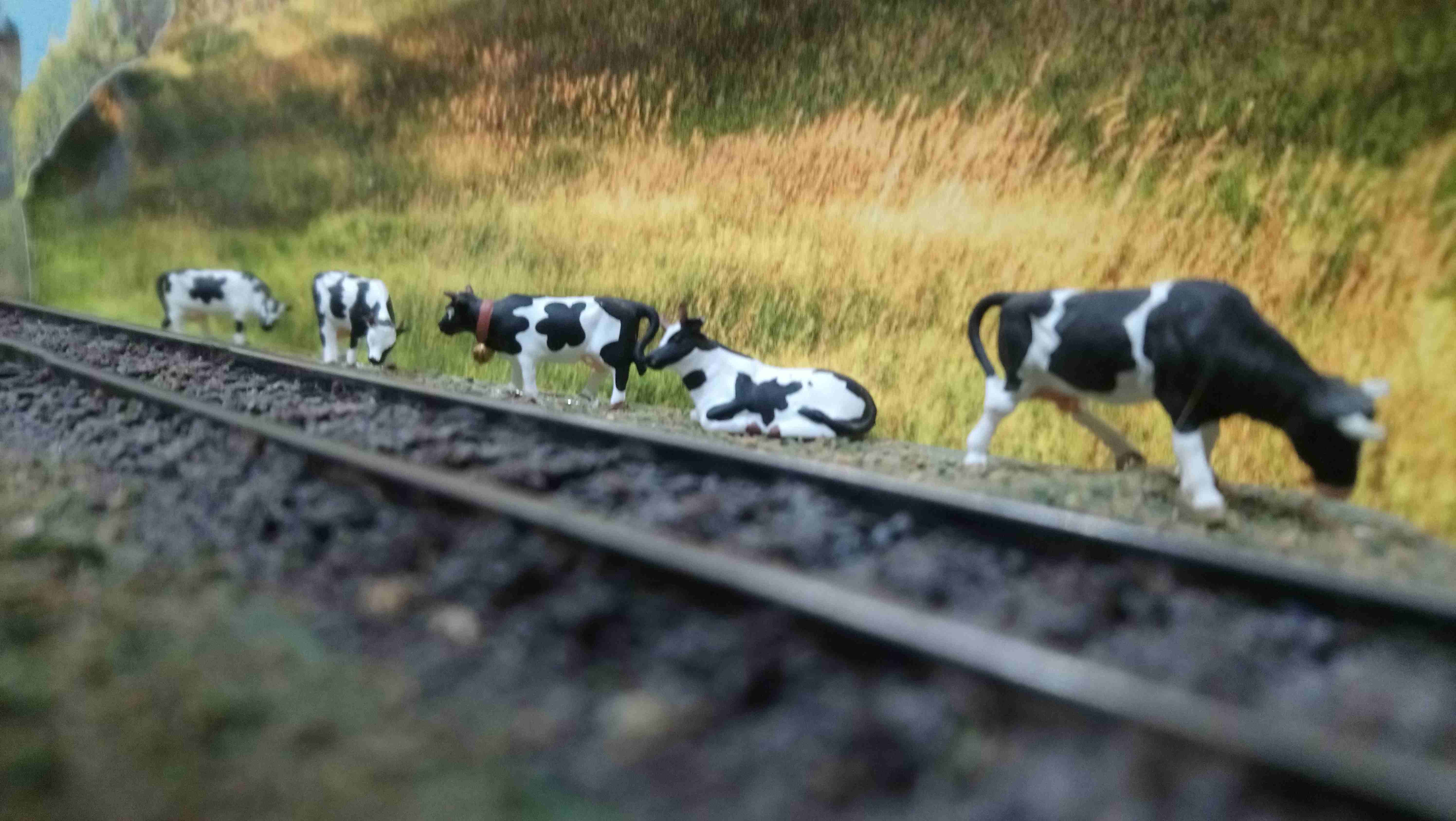На заднем фоне в виде поля,рядом с путями удалось разместить небольшое стадо.На удалении