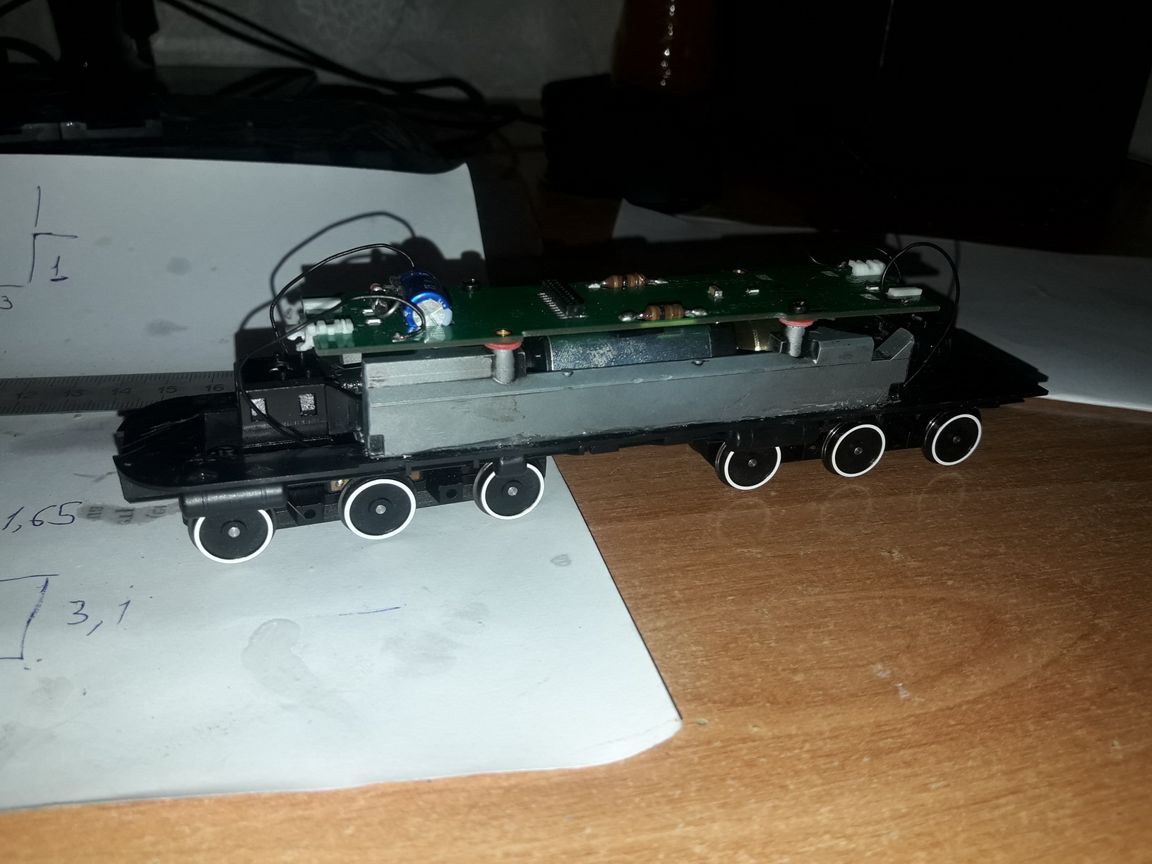 Итак, ходовая. Ввиду одинаковых тележек и базы с М62 вопрос о доноре очевиден. Решил оспользовать не только тележки и двигатель, но и раму рокомашки. Для этого с помощью инструмента типа "болгарка" с неё были убраны топливный бак и законцовки вплотную до шкворней. С нижних продолных граней был убран металл настолько, чтоб конструкция вошла в паз рамы ТЭ3. С самой рамы тэ3 убраны продольные перегородки. Подогнал, закрепил эпоксидкой. Двигатель немного не достигает дна своего паза, становится чуть выше, на 1 мм примерно, но на ходовые качества это не влияет. После сборки проверил, ходовые качества отличные (впрочем, неудивительно, фактически это кинематически неизмененная ходовка рокомашки). Только из-за особеннойстей рамы ТЭ3 ходовка больше не вписывается в радиус R2 (что для меня, мягко говоря, некритично, лично я считаю, что R2 для тех, у кого ну совсем уж плохо со свободным местом. Я и от R3 ухожу в сторону R4 и R5). Далі буде...