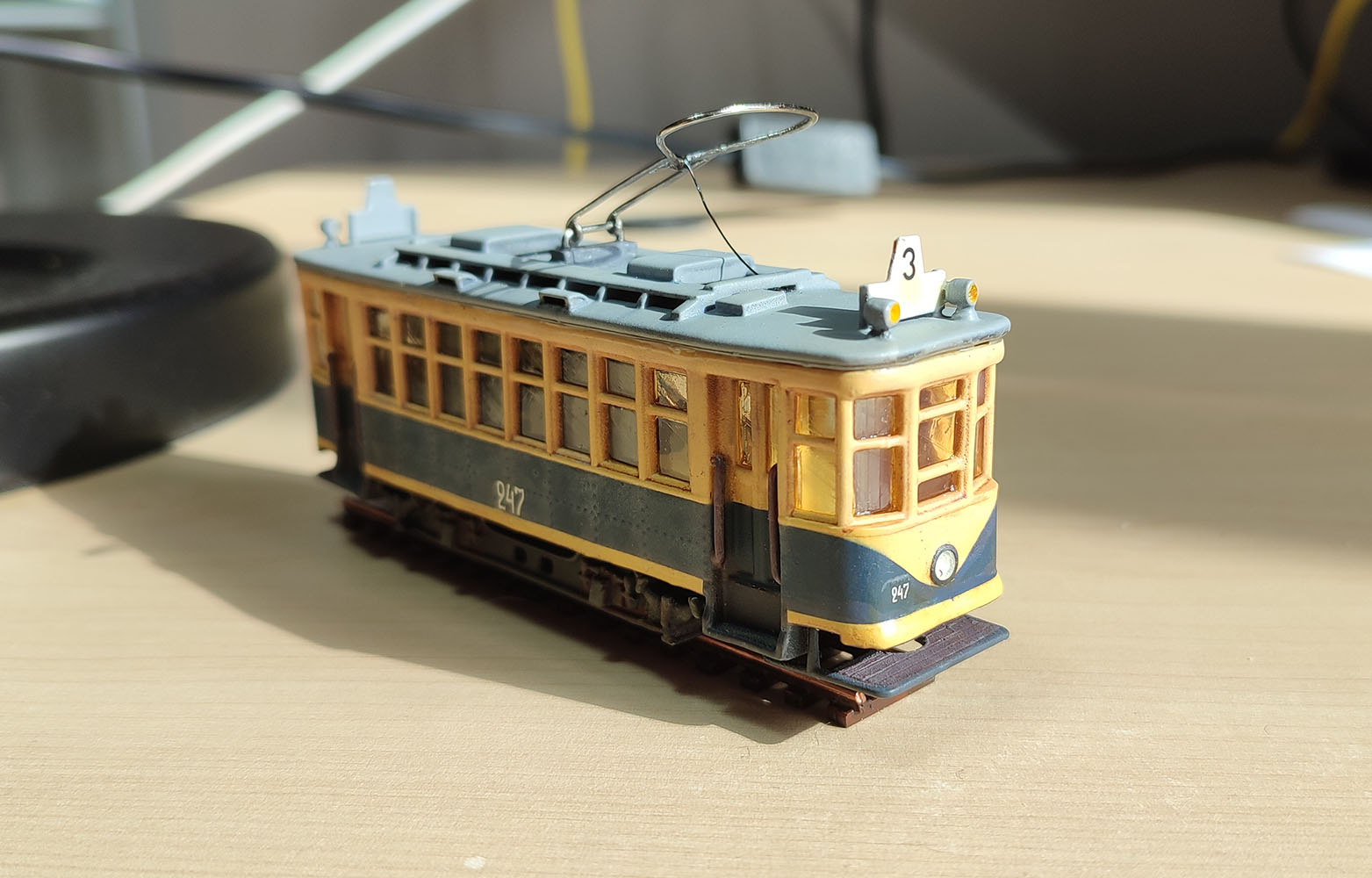 наконец добил долгострой в виде Х в харьковской окраске. Ездить он будет по настольному микромакету 55х55 см, поэтому у него колея 9 мм, что не достоверно. Из крупных косяков - плохая окраска и на некоторых впадинах легла шагренью, хотя везерингом я более менее доволен и он меньше похож на игрушку чем без него. Очень толстые поручни (на тот момент я не догадался сделать их их витой пары) и делал из скрепок. Ну и смолу на окнах в теории можно отполировать, но у меня это не получилось и покрыл толстым слоем лака что б прозрачность была приемлемая, что дало желтоватый оттенок и неоднородность.
