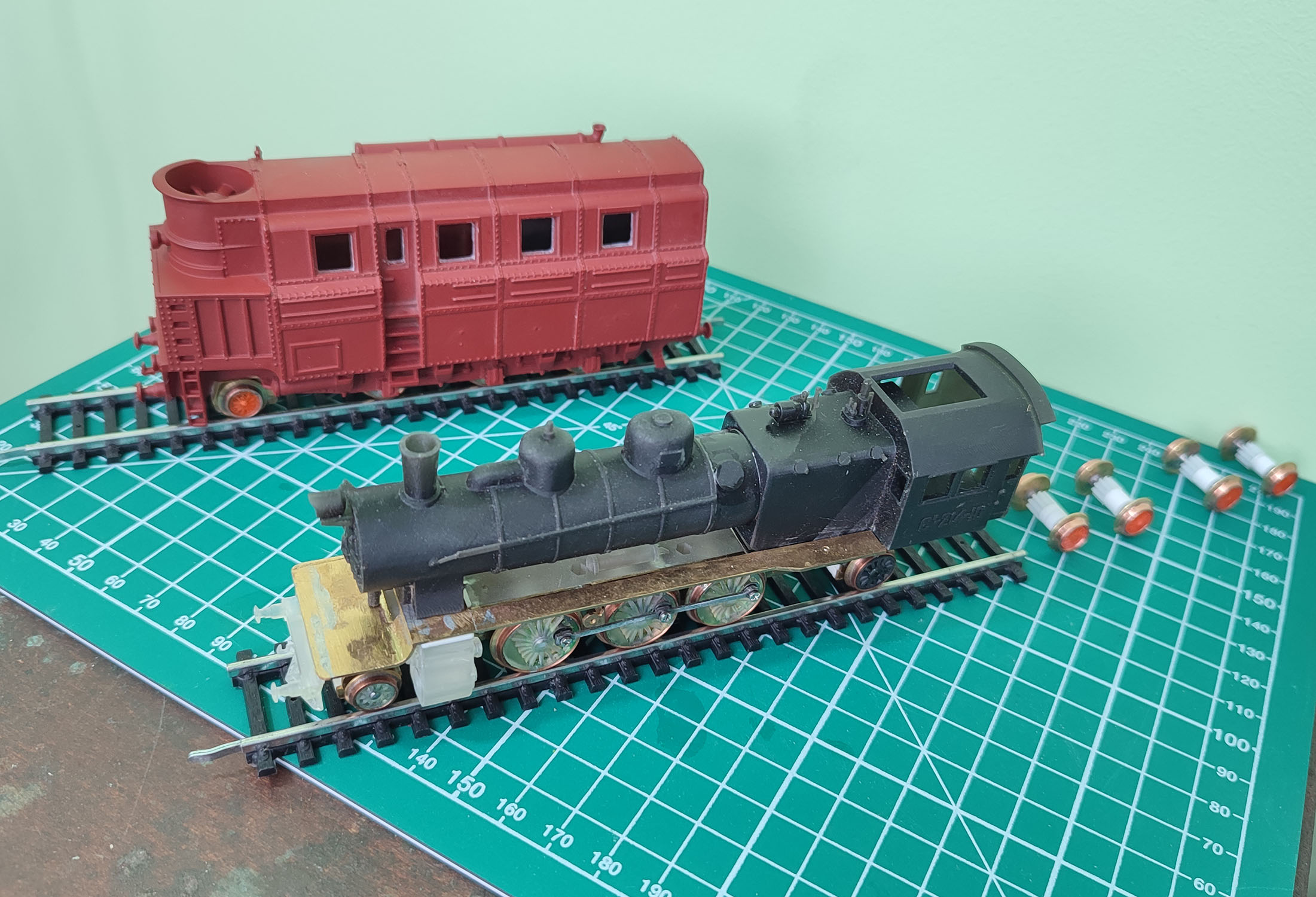 Закончил паровоз GWR 4900 и немного продвинулся с Су (на Су придется переделывать ведущие колеса, как ранее переделал и на английском паровозе. Напаивать оси на большие колеса оказалось слишком хлипким решением, взял оси толще на 0.5 мм и закрепил все на резьбу с пропайкой. Крепче уже не сделать) . На заднем плане заготовка под тепловоз по мотивам Оэл7 (в какой то момент подумал что ошибся с масштабом, настолько это большой сарай относительно паровозов). От GWR 4900 была осталась неиспользованая ходовая часть из тендера, которую неохота было разбирать. Перебрав возможные варианты за интерисуемый период остановился на тепловозе Оэл 7, но пришлось ему сделать на 1 ведущую колпару меньше (хотя по общей длине базы они мало отличаются). Не реалистично (так как и прототип страдал от сильной нагрузки на колпары, не говоря о том что б уюрать одну), но в глаза отличие бросается не так уж сильно
