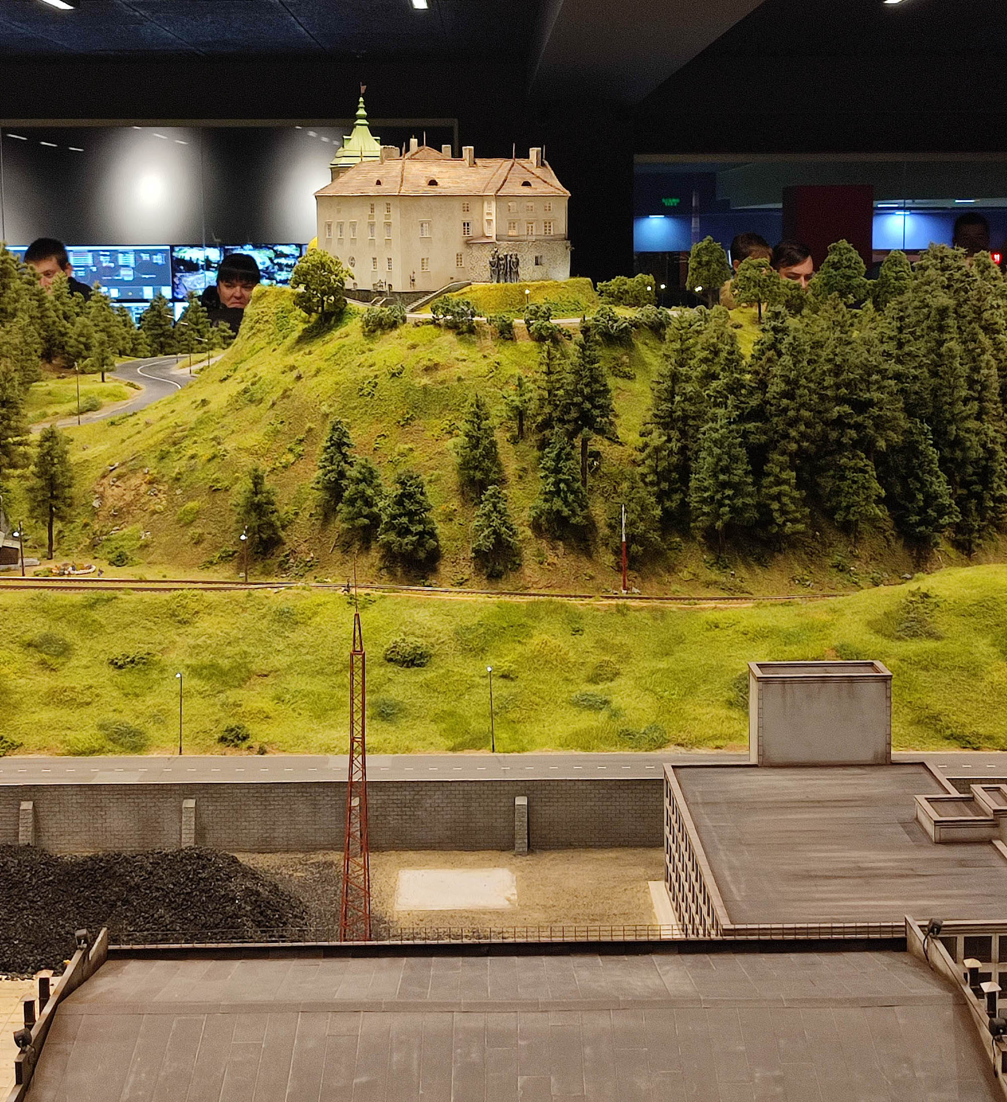 К вопросу узнаваемости. Вокзал Ивано-Франковска воссоздан один к одному, Олесский замок на горе - аналогично. Не говоря уже о том, что "внутренности" у этих строений также полностью воссозданы. Вода в реке - настоящая и водяная мельница приводится в действие именно течением, заслонки на плотине также подвижные и приводятся в действие дистанционно. Очень много сил и времени отдано именно деталям, которых при поверхностном осмотре просто не видно. Электростанция пока не имеет подключения к высоковольтной сети - провода ещё не натянуты и вышки высоковольтной сети не установлены. Кстати, семафоры на путях сделаны в местной мастерской. Есть разработанный и построенный опрокидыватель вагонов возле электростанции для выгрузки угля, а на другой стороне макета возле шахты - погрузчик этого самого угля. И узкоколейный ТУ2, как, впрочем и пассажирские "Пафаваги" - тоже "свои". Для совмещения широкой и узкой колеи на макете есть вокзал Гайворон. Тоже выполненный один к одному.