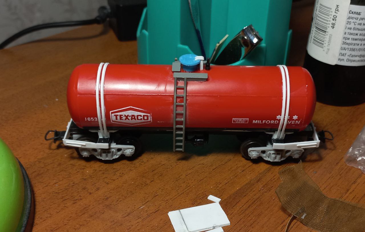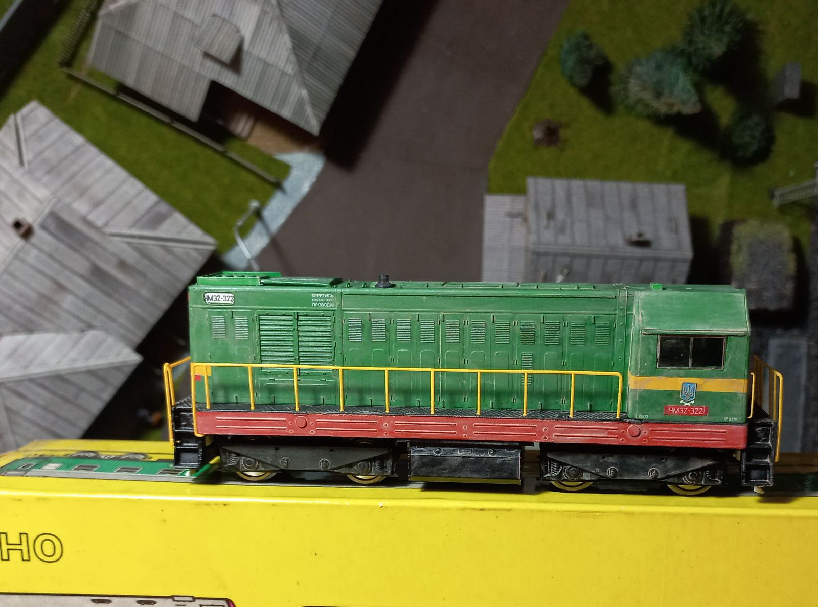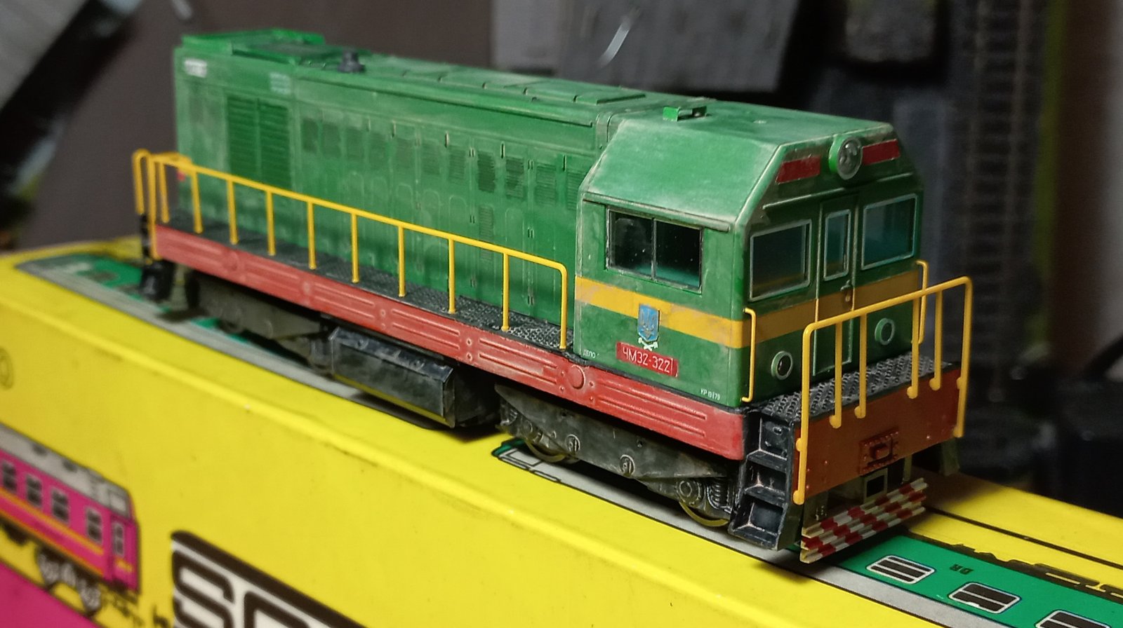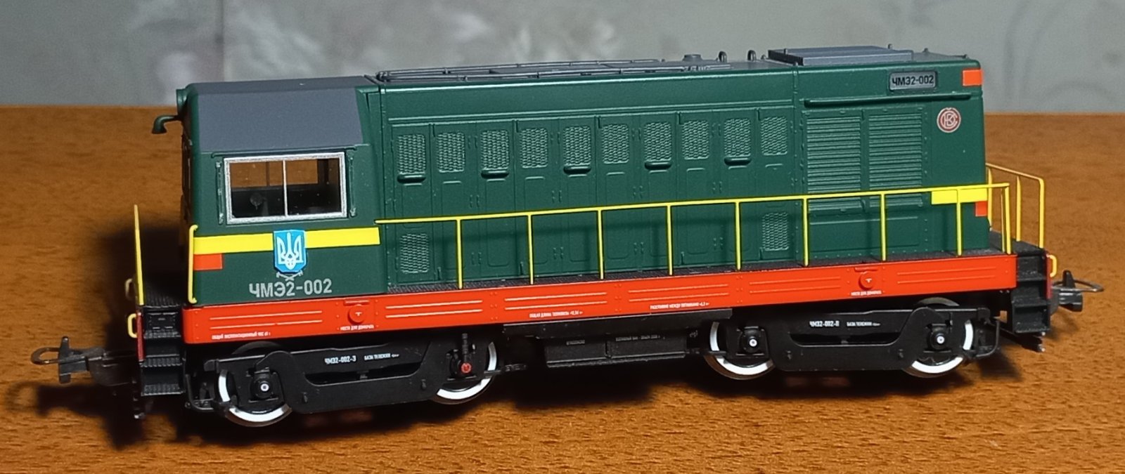 Хотілося лишити ЧМЕ2 у колекції, але не хотілося лишать радянським. Бо за той короткий проміжок з останнього посту про діжку, вагонів з гербами СРСР у мене вже не стало. Їдуть на фронт у вигляді керамічних бронеплит для бійця. :roll: Вандалити сильно лок не хотілося, бо він гарний, і як не фарбуй все одно буде по мотивам. Отже зробив з декалей та полістиролу герби, які повісив на крапельку ПВА.