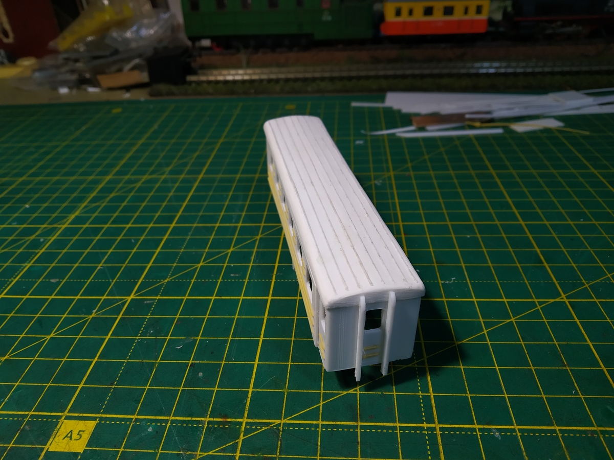 Вагон моего исполнения обрёл немного навесных элементов - поручни и скоб-трап. Образец, как уже упоминалось, тестовый. Сейчас уже чётко видны спорные моменты, требующие другого исполнения как в плане технологии, так и элементарной аккуратности и внимательности.