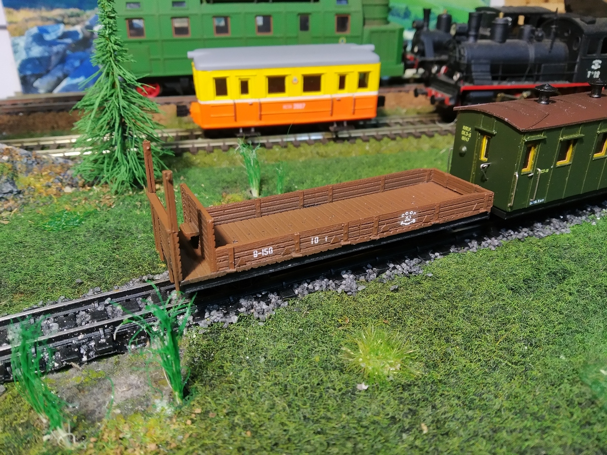 Вагон моего исполнения обрёл немного навесных элементов - поручни и скоб-трап. Образец, как уже упоминалось, тестовый. Сейчас уже чётко видны спорные моменты, требующие другого исполнения как в плане технологии, так и элементарной аккуратности и внимательности.